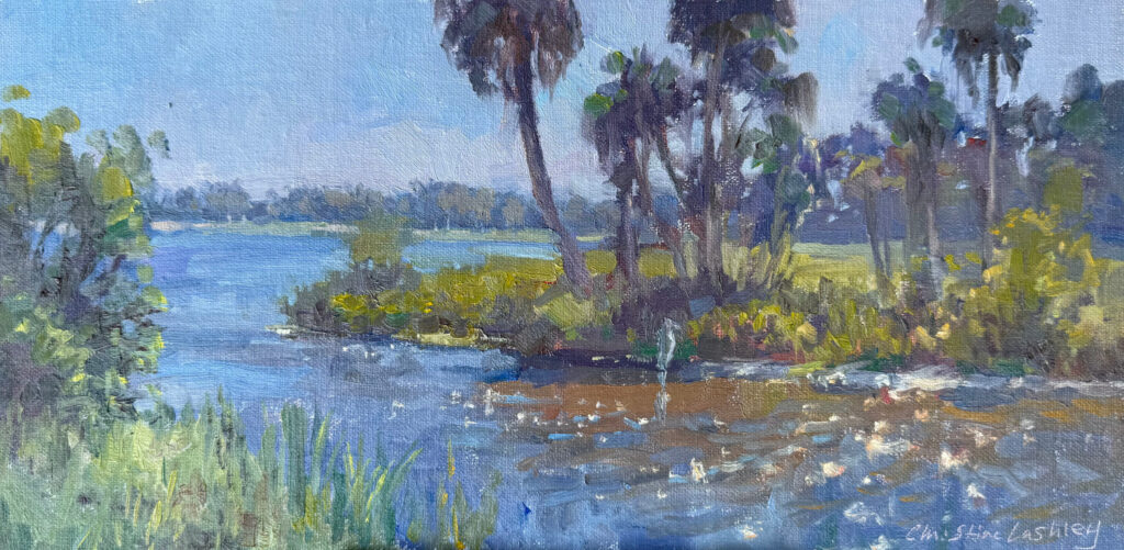 As a contemporary impressionist painter and lifelong nature enthusiast, Christine Lashley gathers most of her ideas by painting outdoors. The art she creates on location or in the studio is about the beauty of a moment held in memory. Her paintings often fuse reality and the abstract, using color and texture to look realistic from afar but dissolve into abstraction up close.