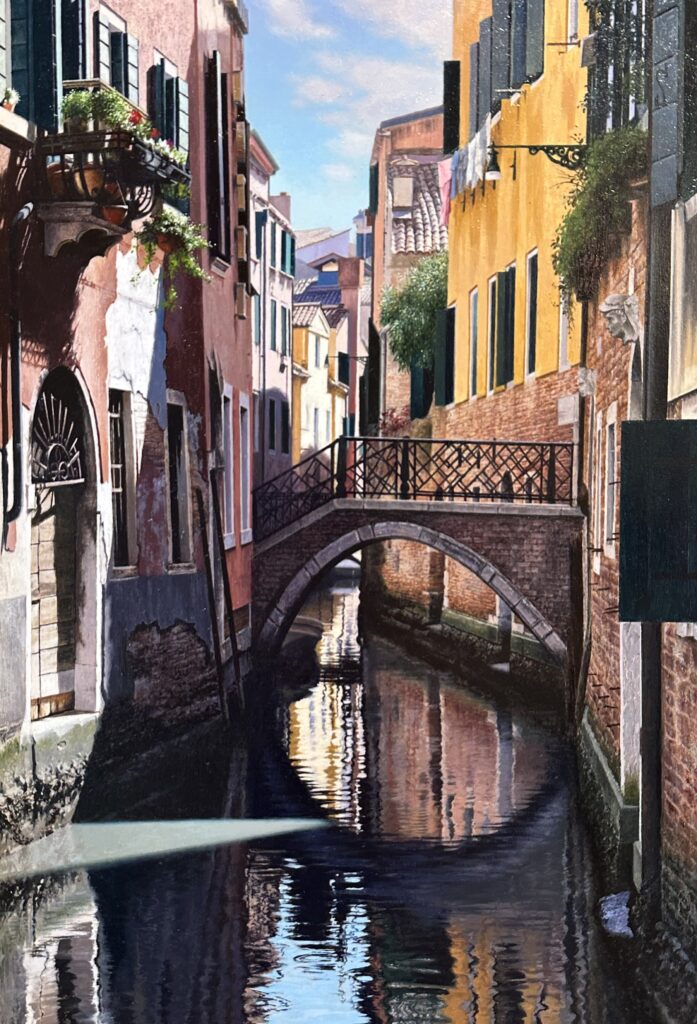 Mike Briscoe is a contemporary realist painter whose work captures the enduring atmosphere and architecture of Europe’s most storied cities. Known for his intimate oil studies of Venetian canals, historic façades, and lively café scenes with waiters at work, Briscoe’s paintings balance crisp detail with a painterly sensitivity to light and reflection. His canvases invite viewers into a dialogue between history and daily life, where the past and present intermingle on water and stone.
