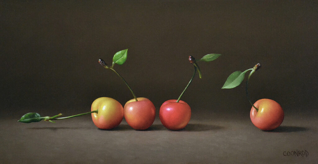 In recent years, Coonrod has focused primarily on still life painting, often using fruit as her central subject. Occasionally, she includes other objects to introduce additional shapes and colors into the composition. She is drawn to fruit for its vibrant, natural form—each piece unique, with an implied gesture and personality. Its impermanence also plays a crucial role: as fruit inevitably decomposes, each painting becomes a quiet race against time, a lasting record of something fleeting.