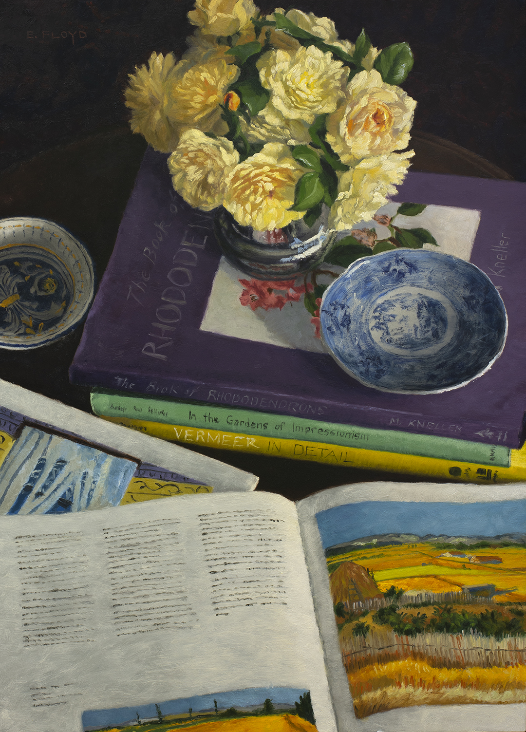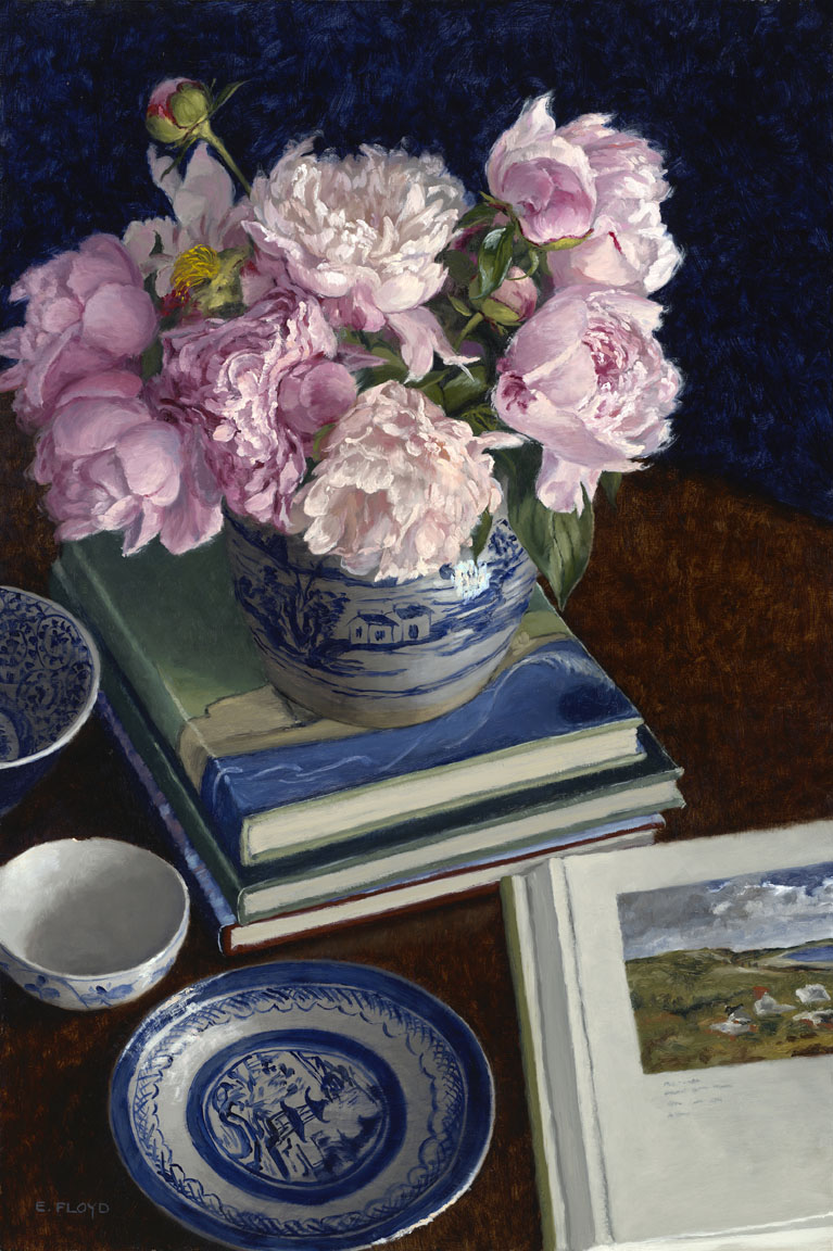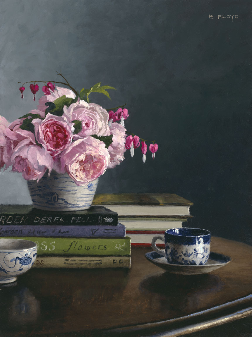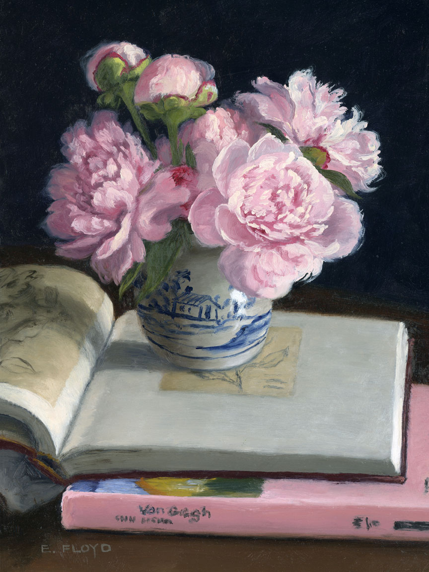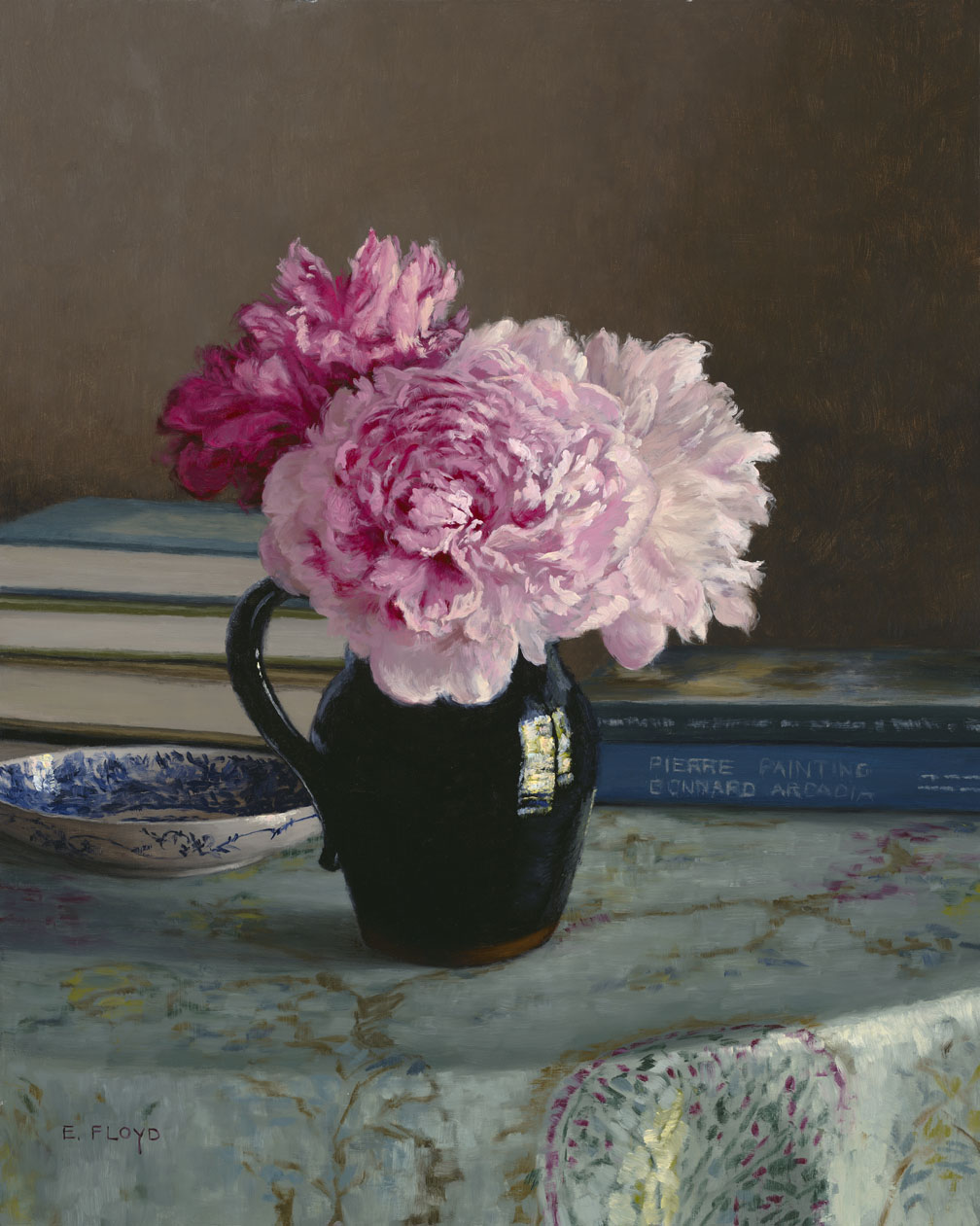 Elizabeth loves painting the flowers she grows in her own garden. She works with oils in a colorist manner utilizing a full-color palette. She applies layers of color tints wet-in-wet in order to build up form, value, and color. Her work is highly rendered, but she allows brushwork to exhibit the textural effects that paint application can achieve. When focusing on still life, her studio practice is to work from life in only natural light.