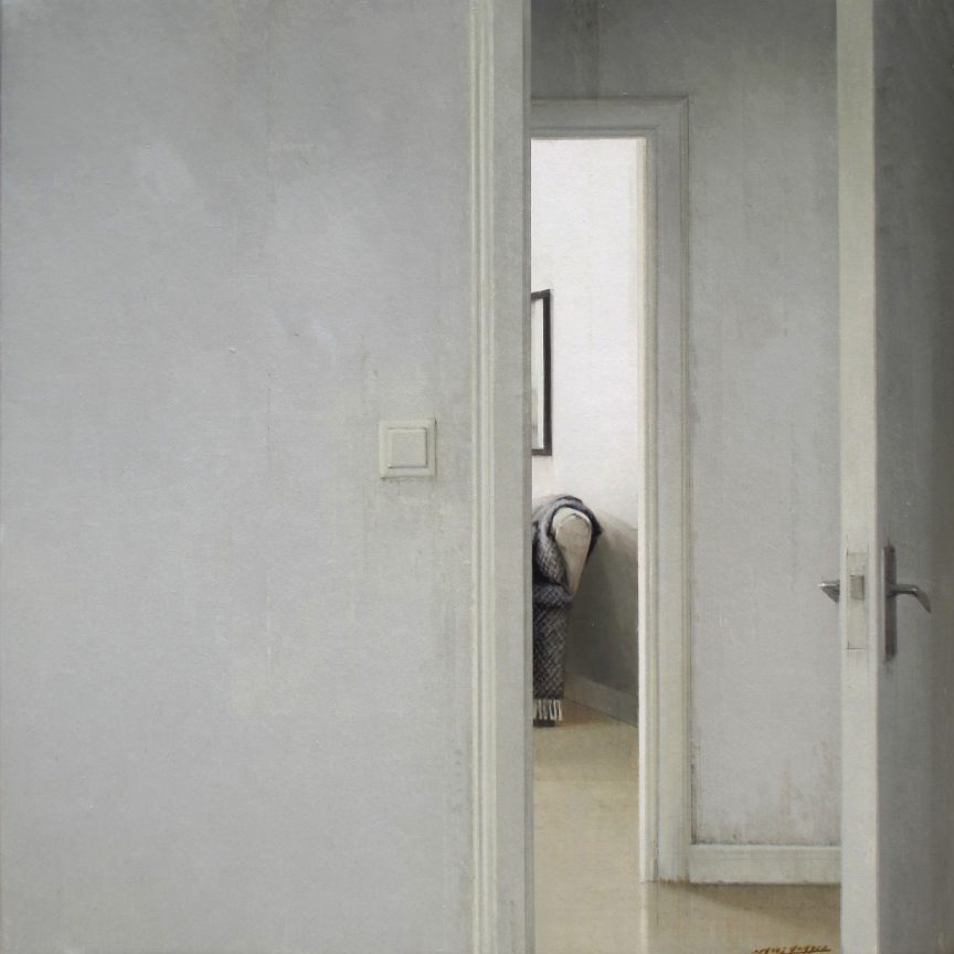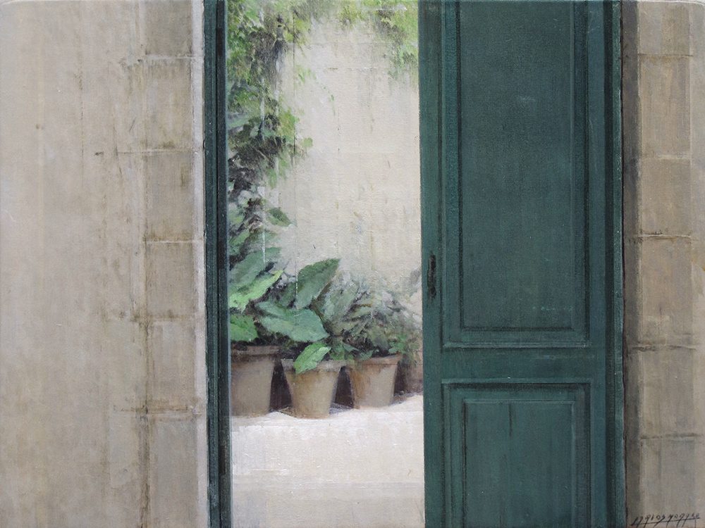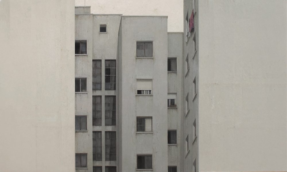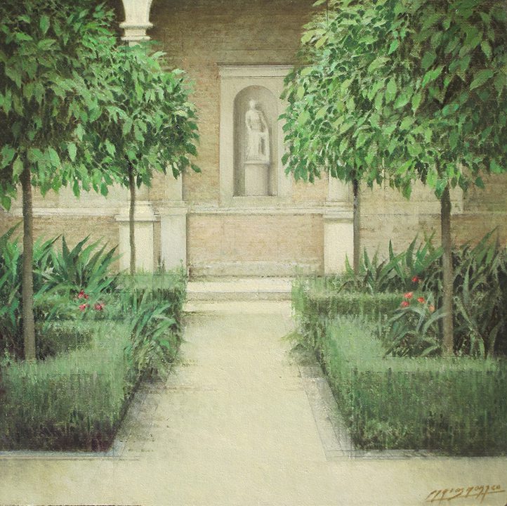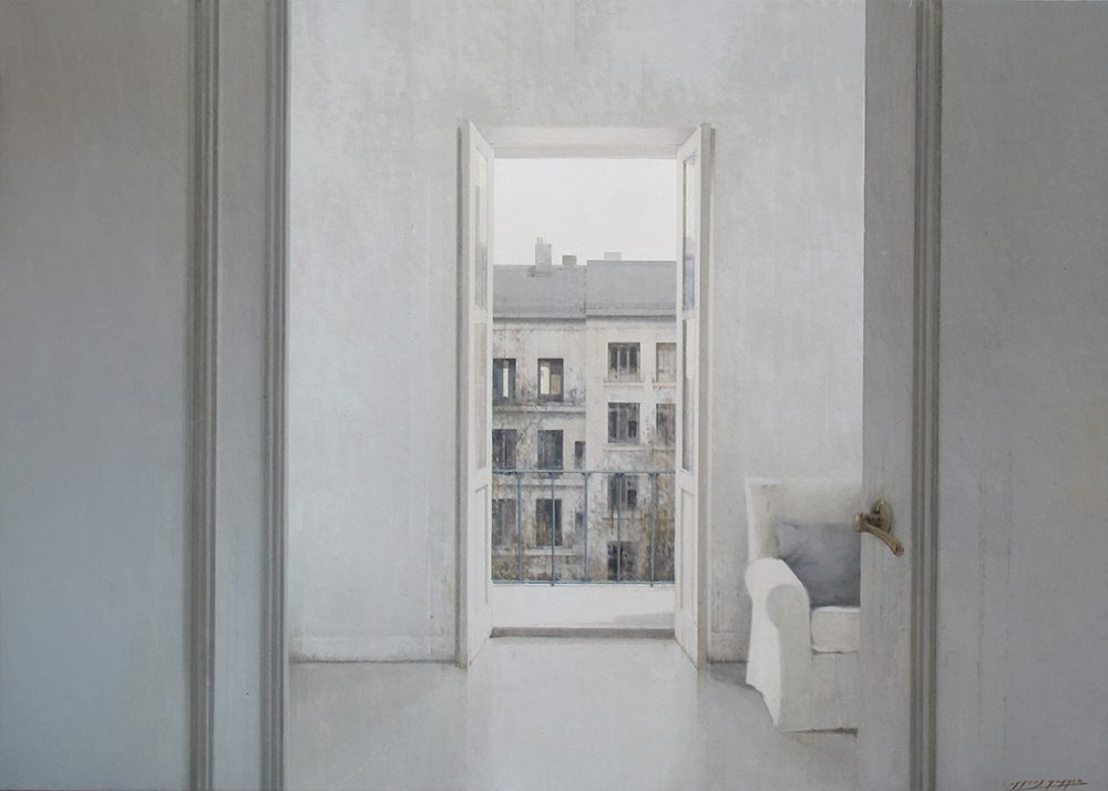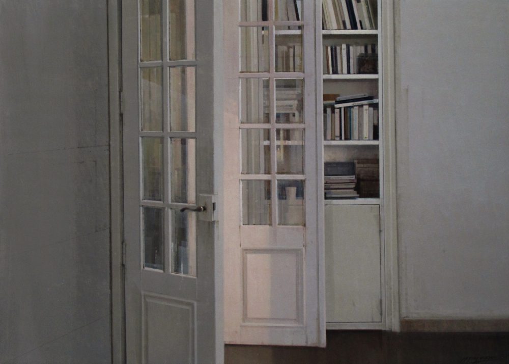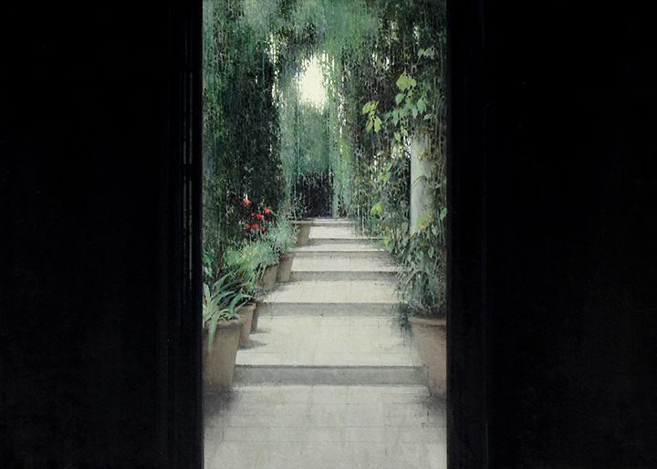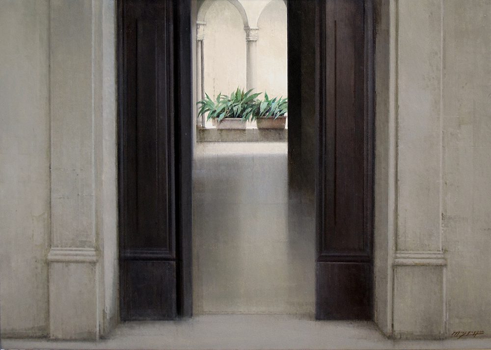 One of the artist’s favorite subjects are empty and bare spaces, which are serene, balanced and enveloped in a special atmosphere of light depicted by grey and ochre tones. Often these spaces open to panoramic views of cities. Other times they lead to other spaces only partially shown in the background like gardens and patios.