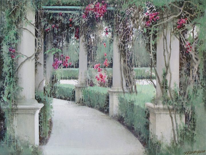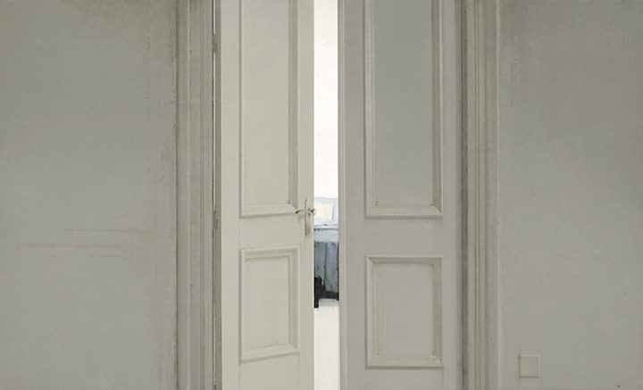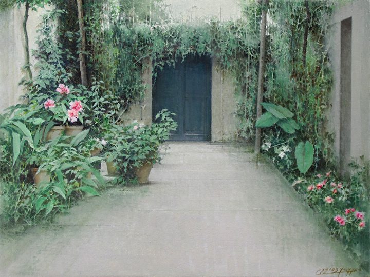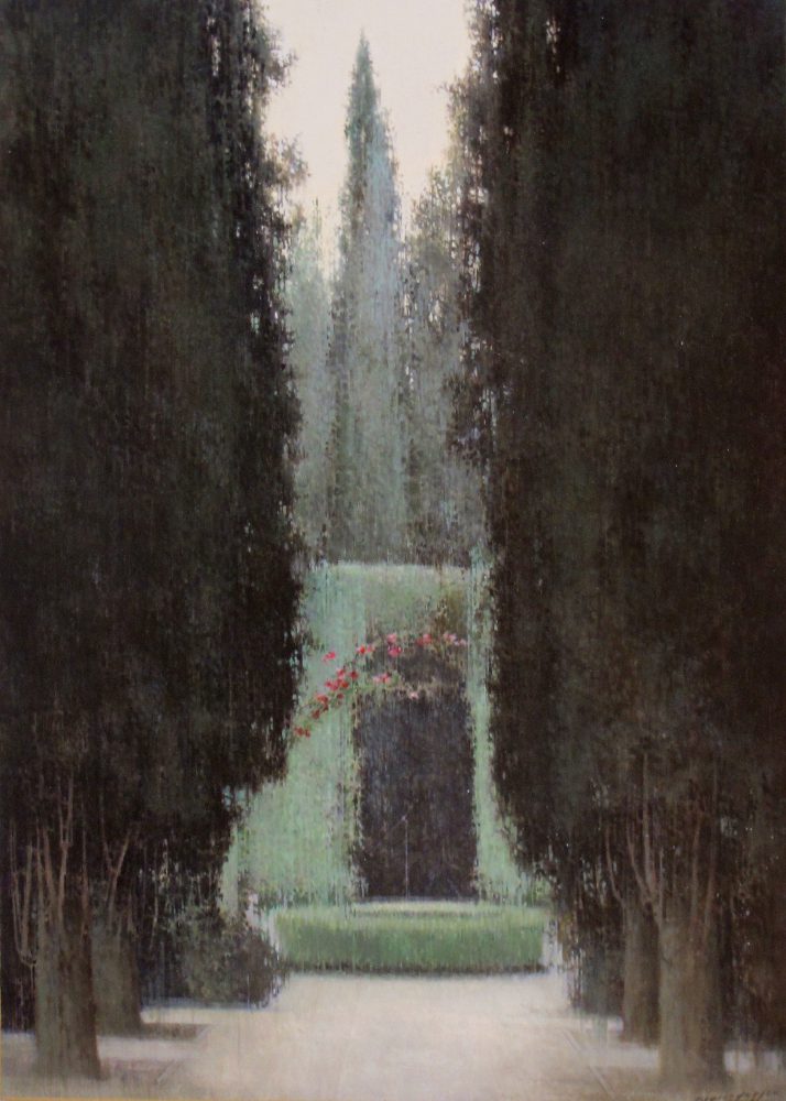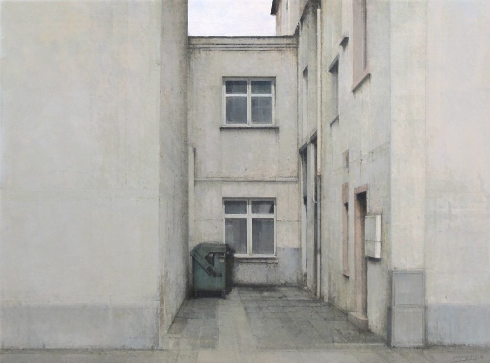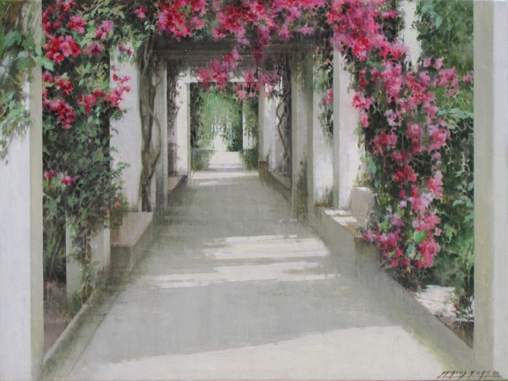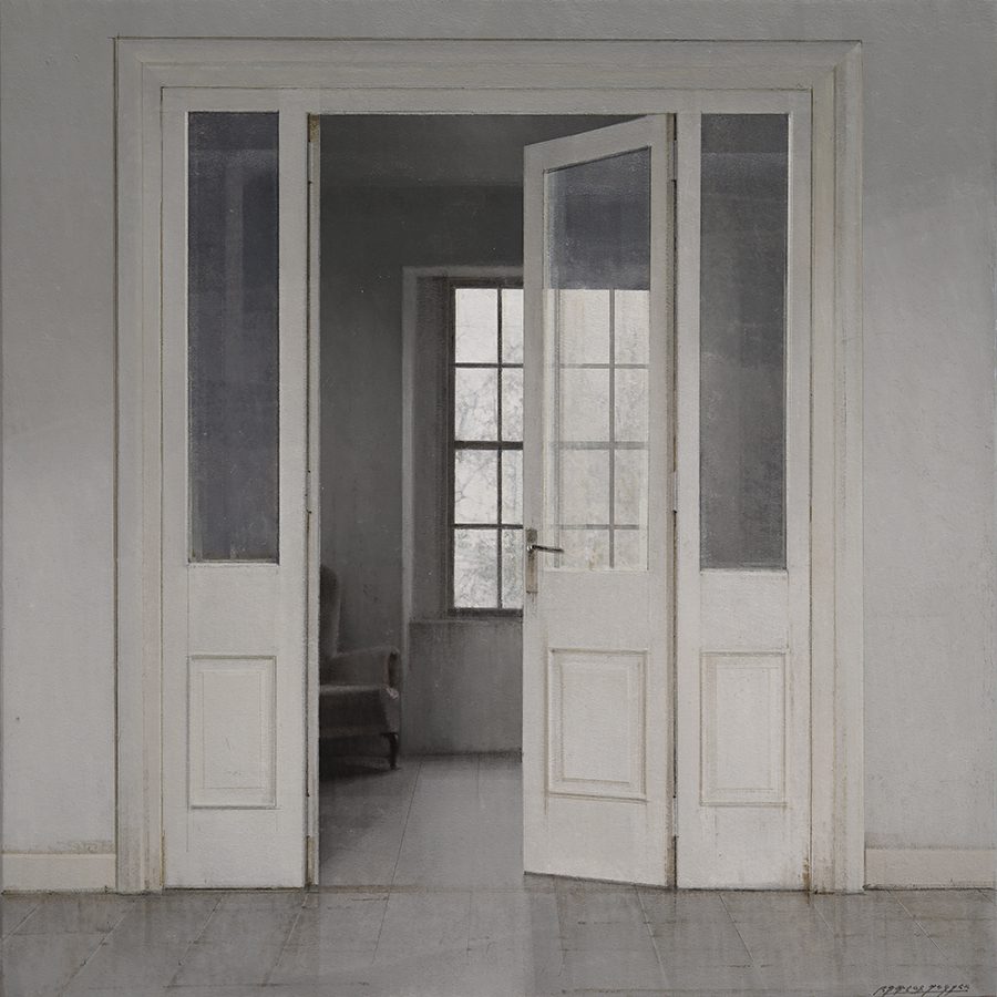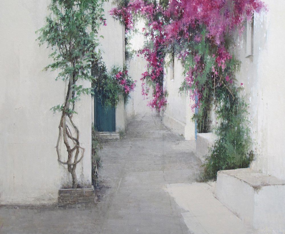 One of the artist’s favorite subjects are empty and bare spaces, which are serene, balanced and enveloped in a special atmosphere of light depicted by grey and ochre tones. Often these spaces open to panoramic views of cities. Other times they lead to other spaces only partially shown in the background like gardens and patios.