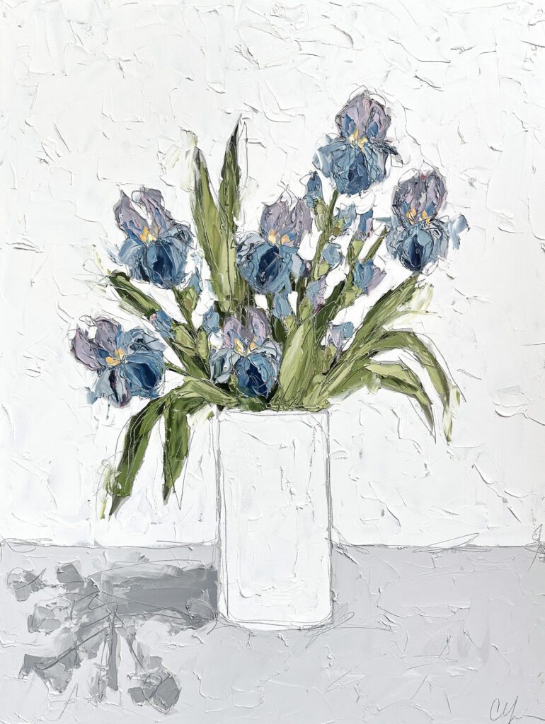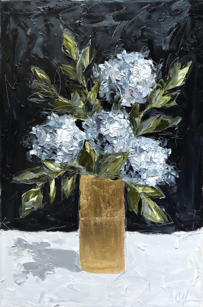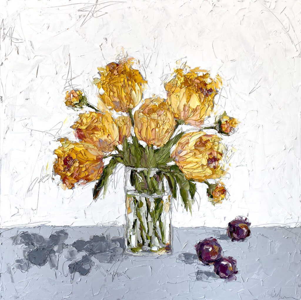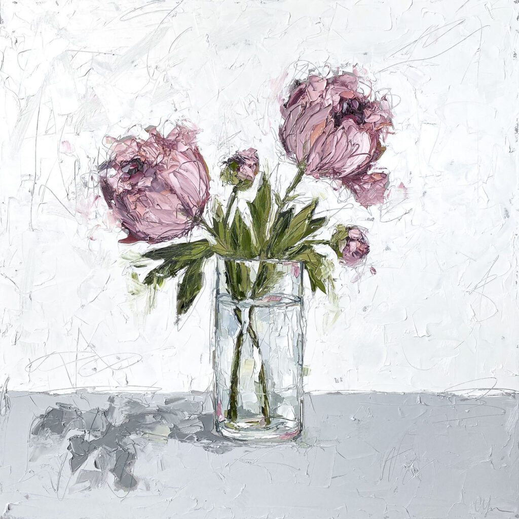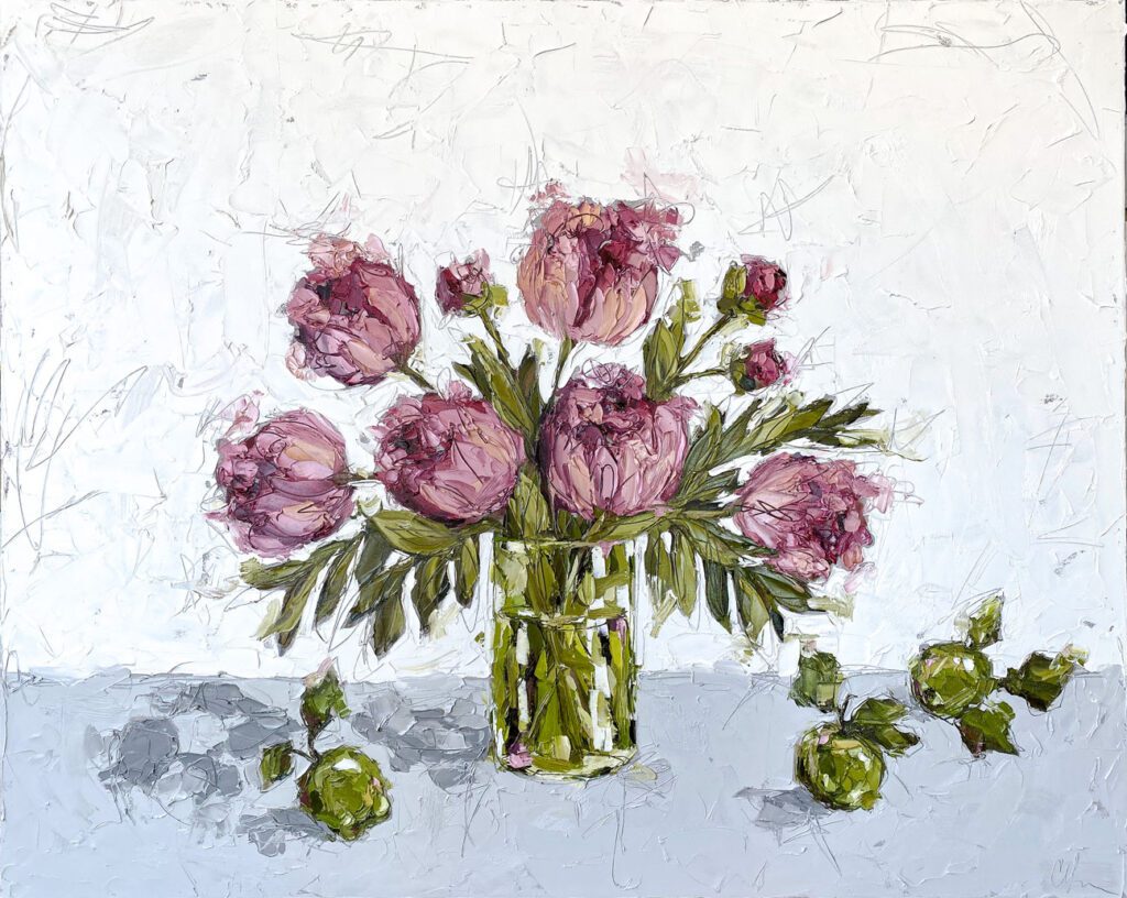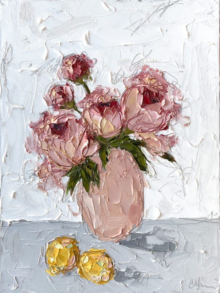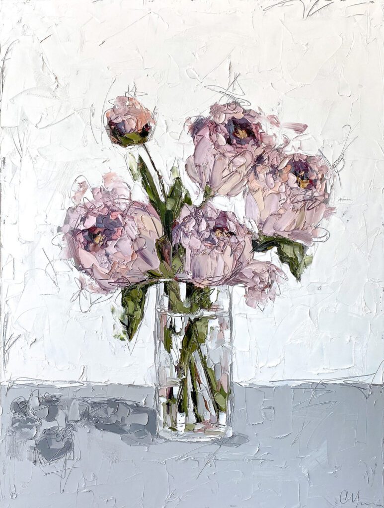 She pushes this idea further by deconstructing her view into simpler elements and destroying the obvious while simultaneously including authentic moments to convey more elaborate ideas. She is intrigued with contrasting interactions; simple vs. complex, classic vs. modern, clarity vs. ambiguity, order vs. chaos, depth vs. shallowness, negative space vs. positive space, etc. She uses texture and line to define form by sculpting oil paint with her palette knife and pencil while scratching away paint with various tools, aka, Sgraffito. All of these elements combined with her creativity and skill bring to life a painting that displays imperfect beauty in a very unique style. She finds the most freedom of expression through various subject matter but is most known for her floral still lifes, waterlilies, botanicals, and abstracts. However, not to place limits on herself, she at times enjoys experimentation with other subjects while working with several mediums and tools at times…because…