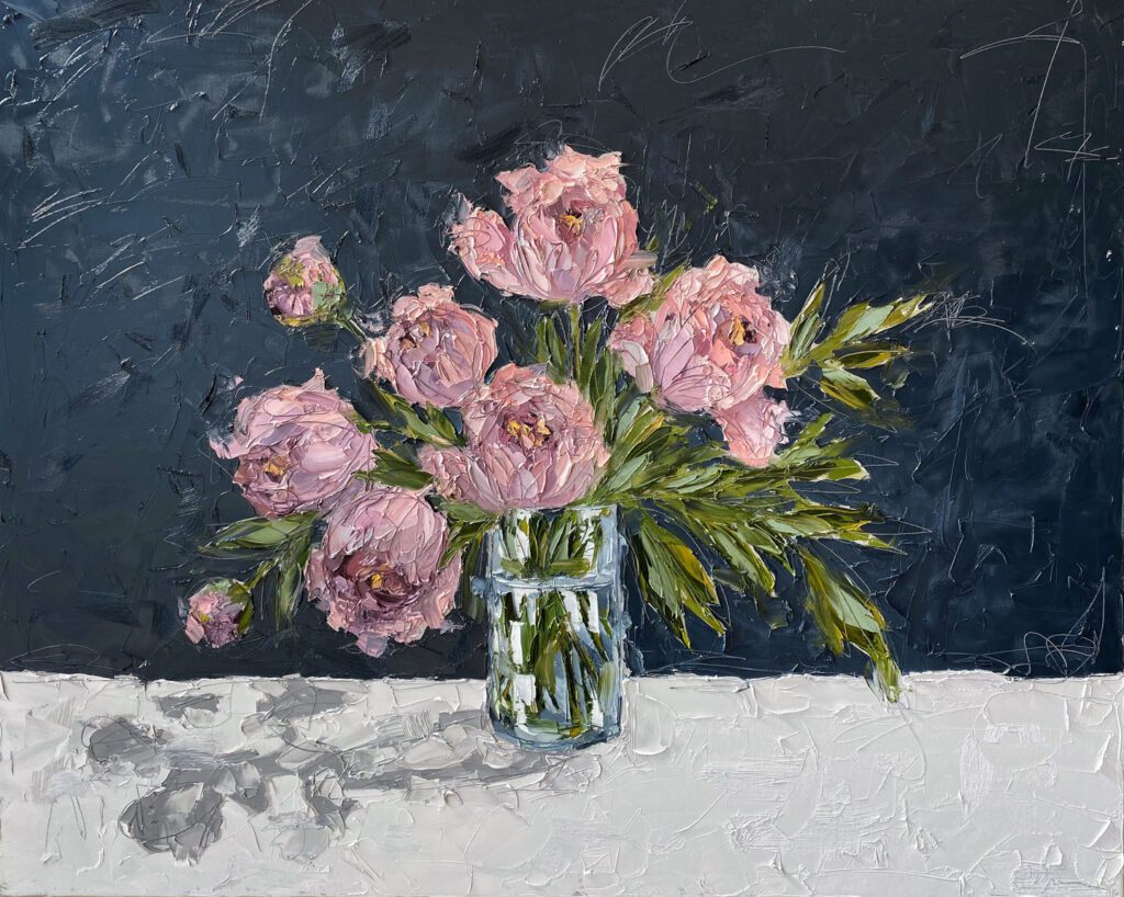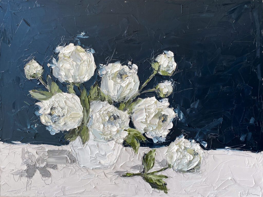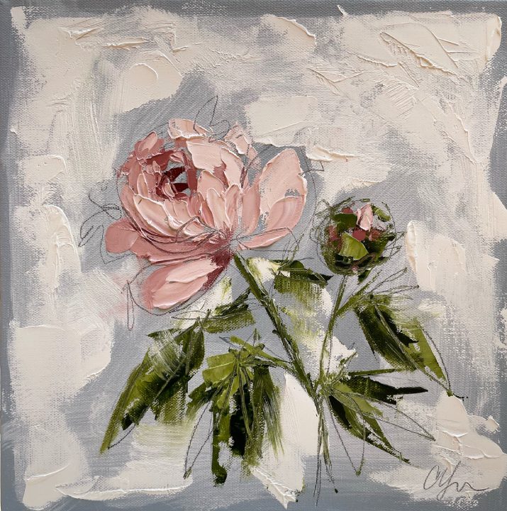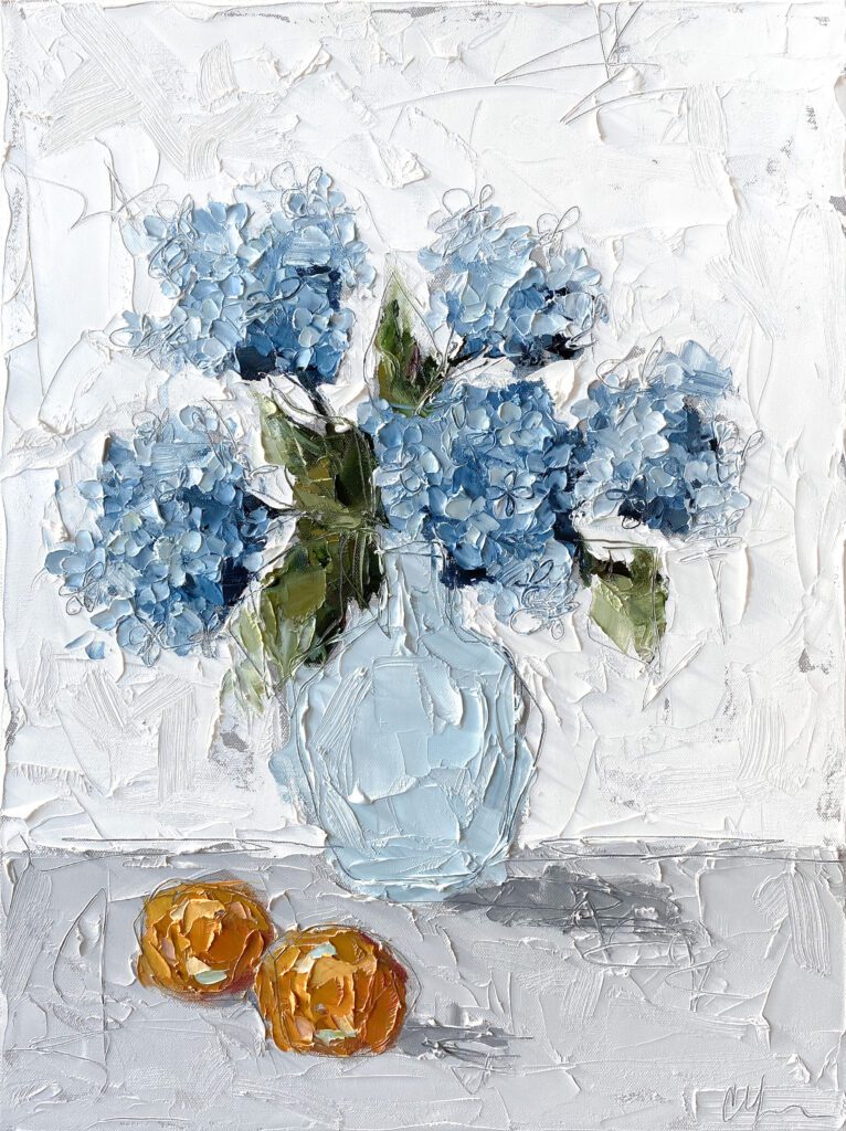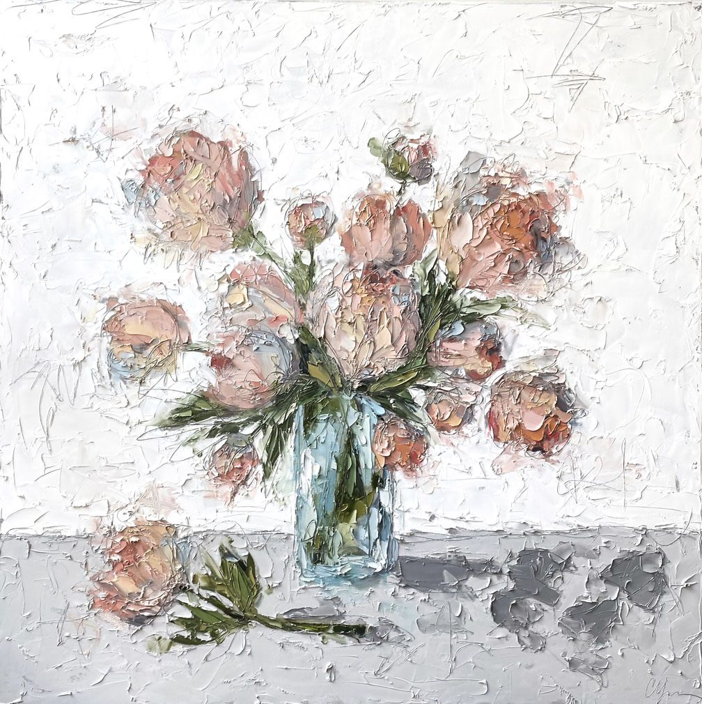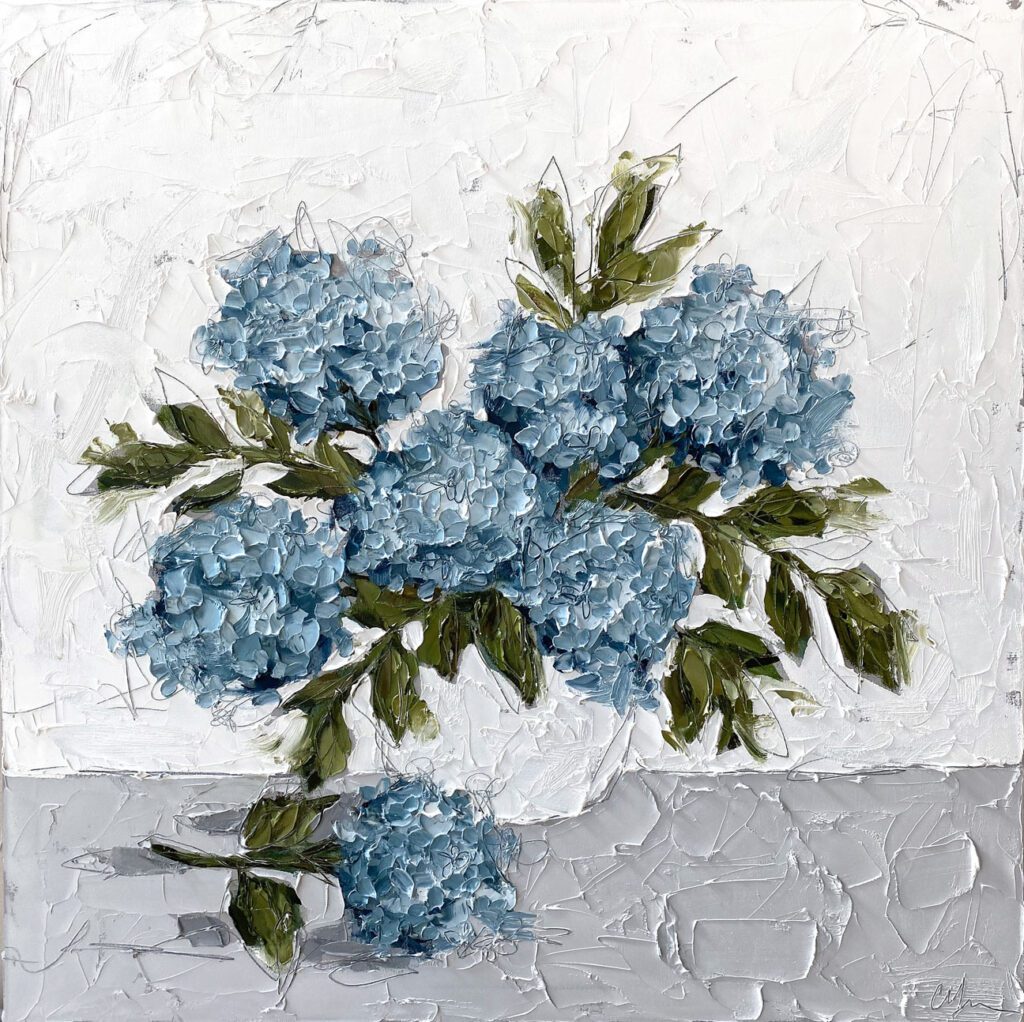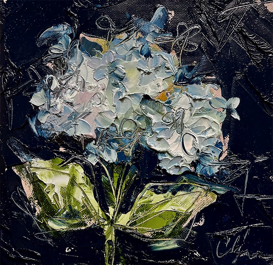 She pushes this idea further by deconstructing her view into simpler elements and destroying the obvious while simultaneously including authentic moments to convey more elaborate ideas. She is intrigued with contrasting interactions; simple vs. complex, classic vs. modern, clarity vs. ambiguity, order vs. chaos, depth vs. shallowness, negative space vs. positive space, etc. She uses texture and line to define form by sculpting oil paint with her palette knife and pencil while scratching away paint with various tools, aka, Sgraffito. All of these elements combined with her creativity and skill bring to life a painting that displays imperfect beauty in a very unique style. She finds the most freedom of expression through various subject matter but is most known for her floral still lifes, waterlilies, botanicals, and abstracts. However, not to place limits on herself, she at times enjoys experimentation with other subjects while working with several mediums and tools at times…because…