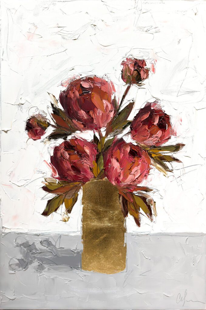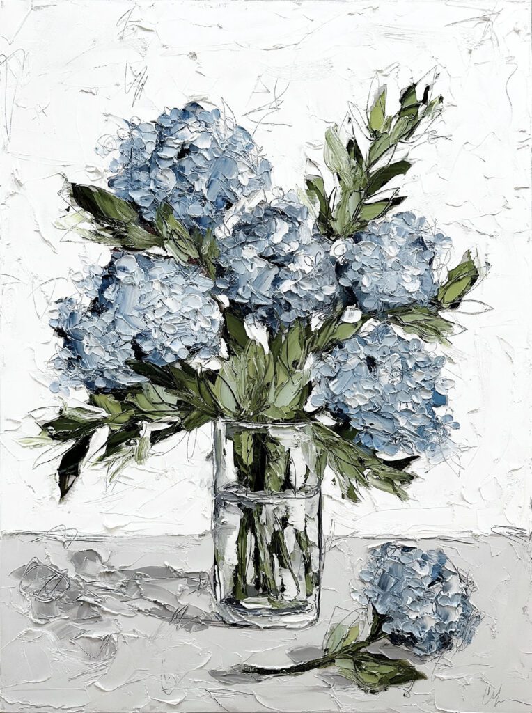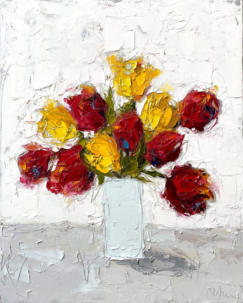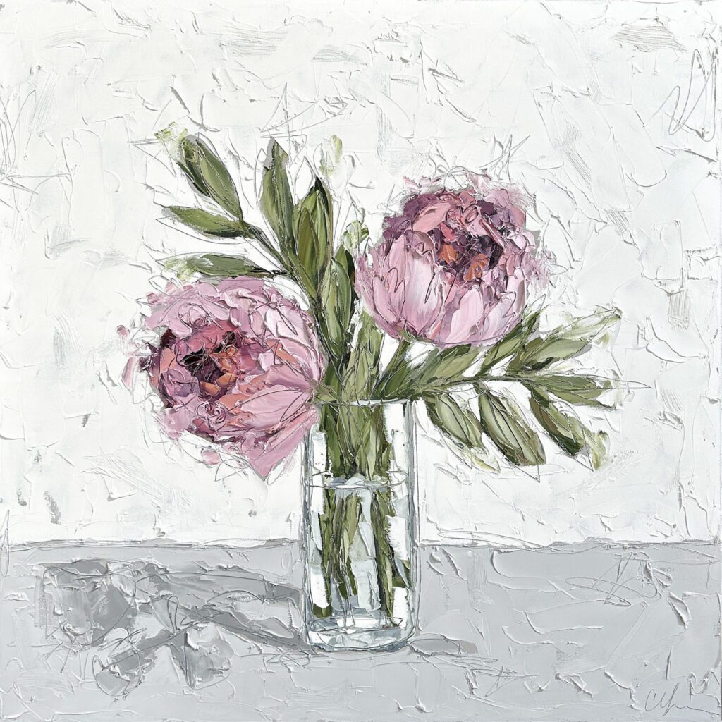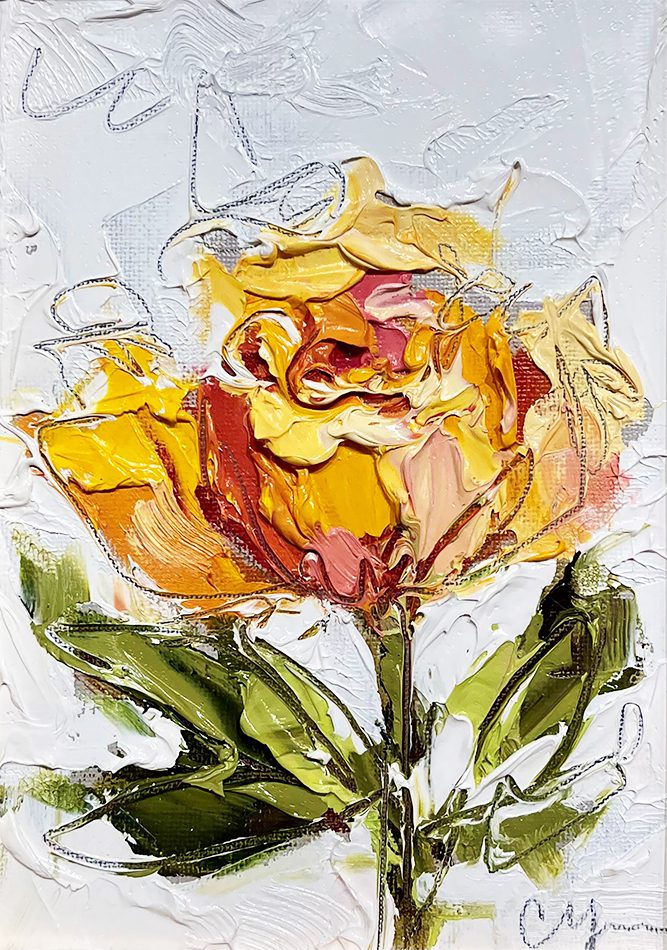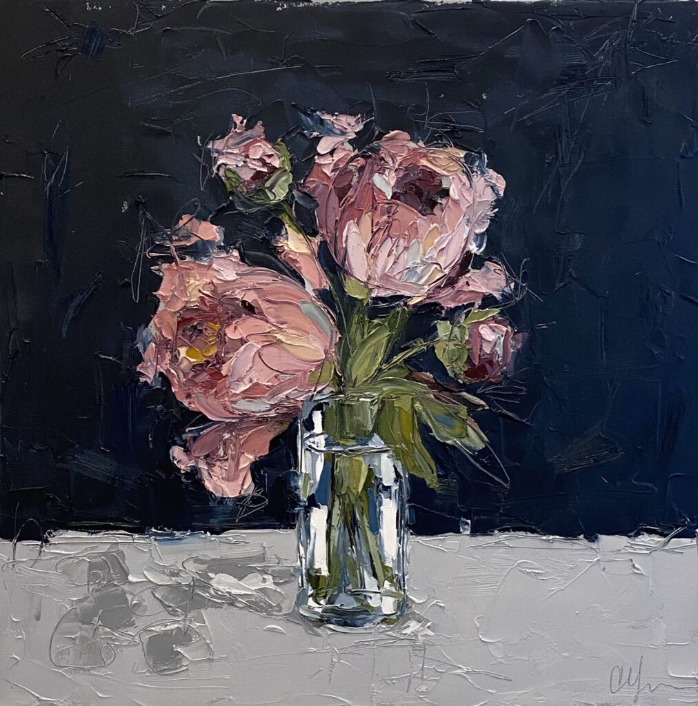 She pushes this idea further by deconstructing her view into simpler elements and destroying the obvious while simultaneously including authentic moments to convey more elaborate ideas. She is intrigued with contrasting interactions; simple vs. complex, classic vs. modern, clarity vs. ambiguity, order vs. chaos, depth vs. shallowness, negative space vs. positive space, etc. She uses texture and line to define form by sculpting oil paint with her palette knife and pencil while scratching away paint with various tools, aka, Sgraffito. All of these elements combined with her creativity and skill bring to life a painting that displays imperfect beauty in a very unique style. She finds the most freedom of expression through various subject matter but is most known for her floral still lifes, waterlilies, botanicals, and abstracts. However, not to place limits on herself, she at times enjoys experimentation with other subjects while working with several mediums and tools at times…because…