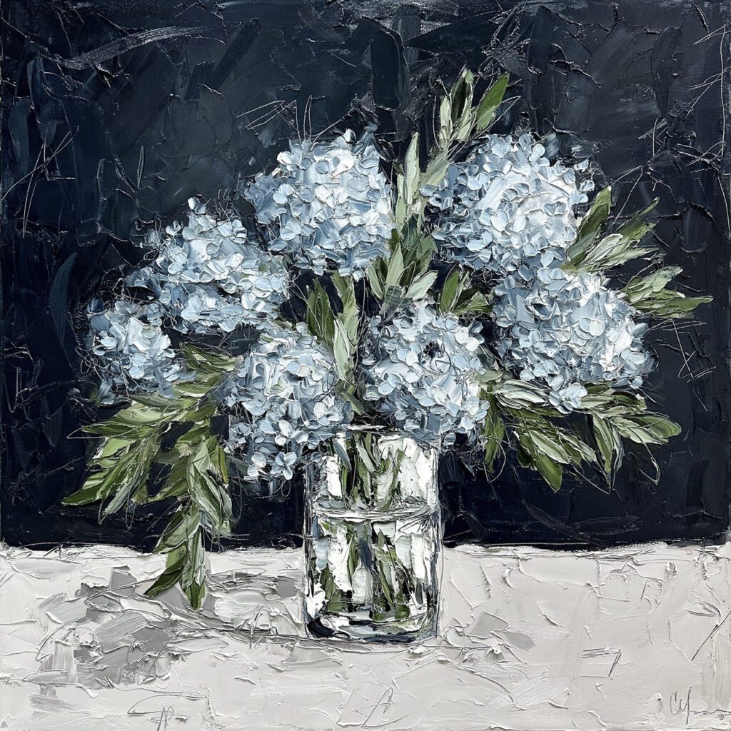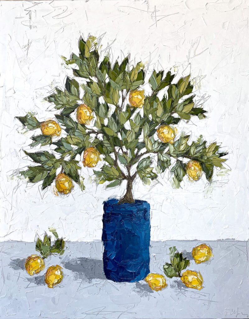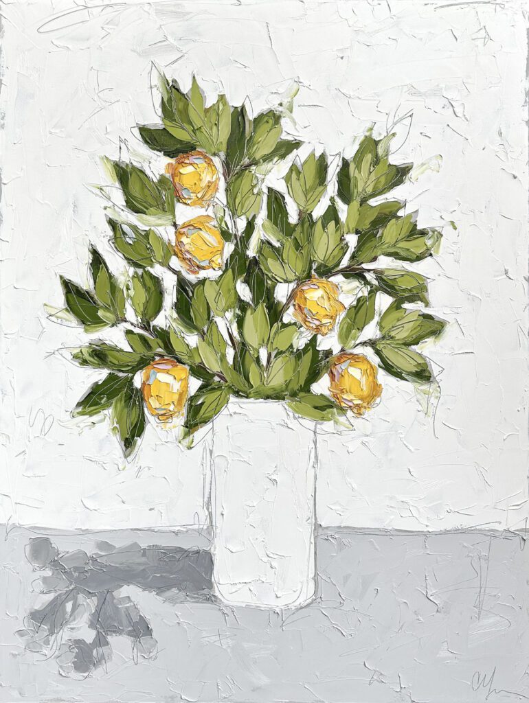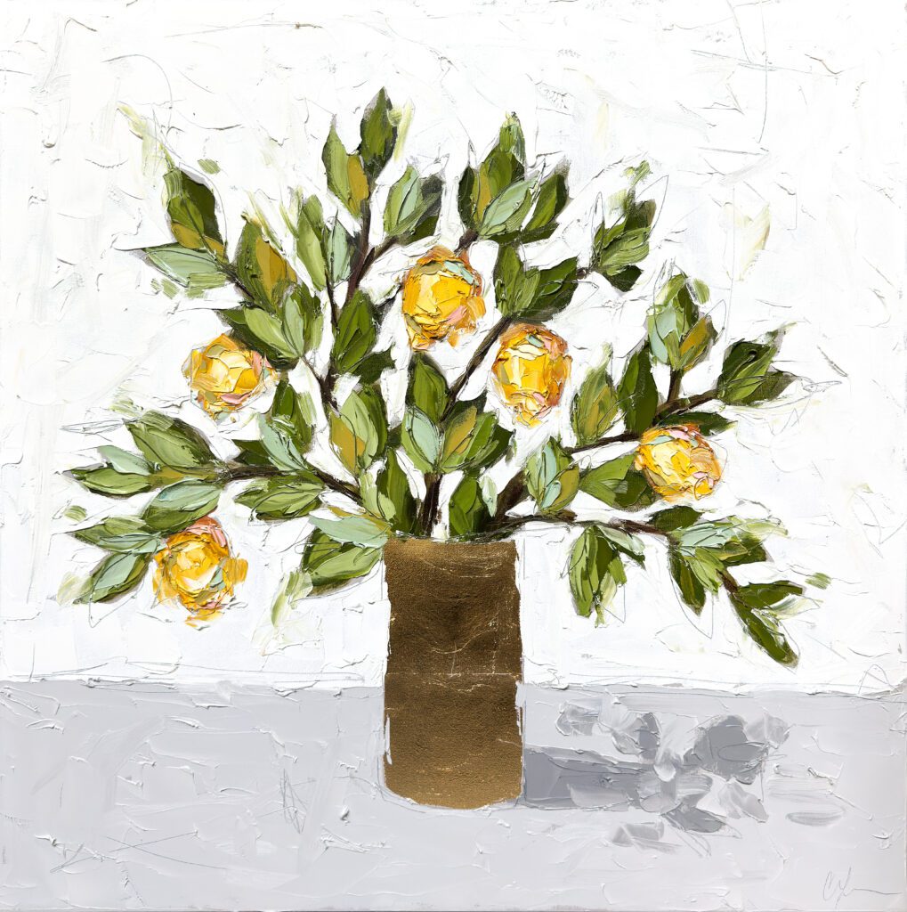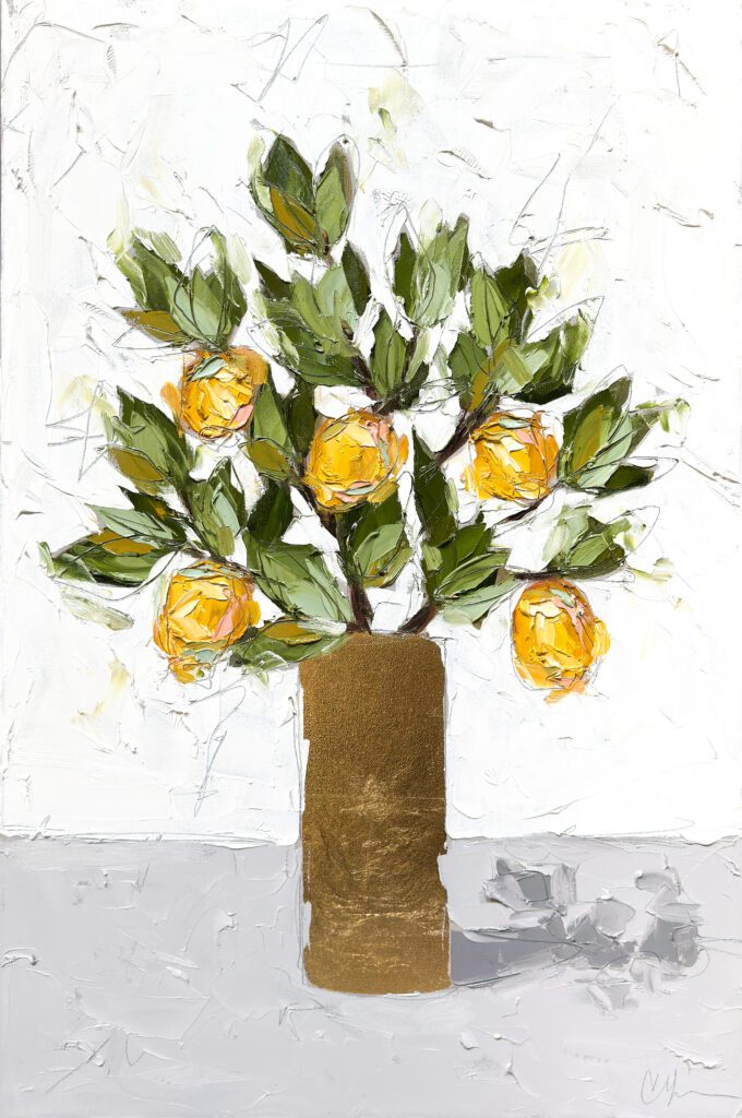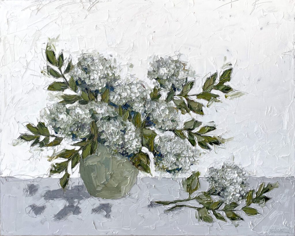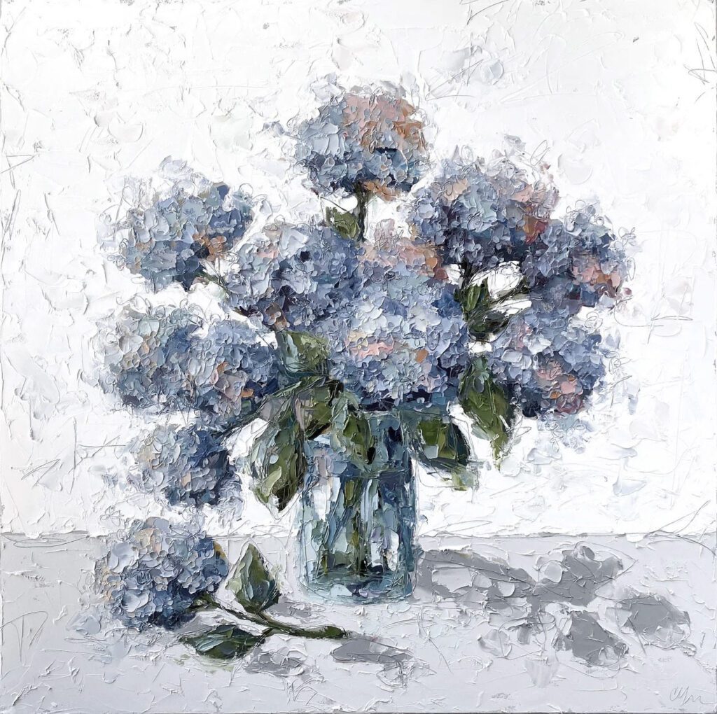 She pushes this idea further by deconstructing her view into simpler elements and destroying the obvious while simultaneously including authentic moments to convey more elaborate ideas. She is intrigued with contrasting interactions; simple vs. complex, classic vs. modern, clarity vs. ambiguity, order vs. chaos, depth vs. shallowness, negative space vs. positive space, etc. She uses texture and line to define form by sculpting oil paint with her palette knife and pencil while scratching away paint with various tools, aka, Sgraffito. All of these elements combined with her creativity and skill bring to life a painting that displays imperfect beauty in a very unique style. She finds the most freedom of expression through various subject matter but is most known for her floral still lifes, waterlilies, botanicals, and abstracts. However, not to place limits on herself, she at times enjoys experimentation with other subjects while working with several mediums and tools at times…because…