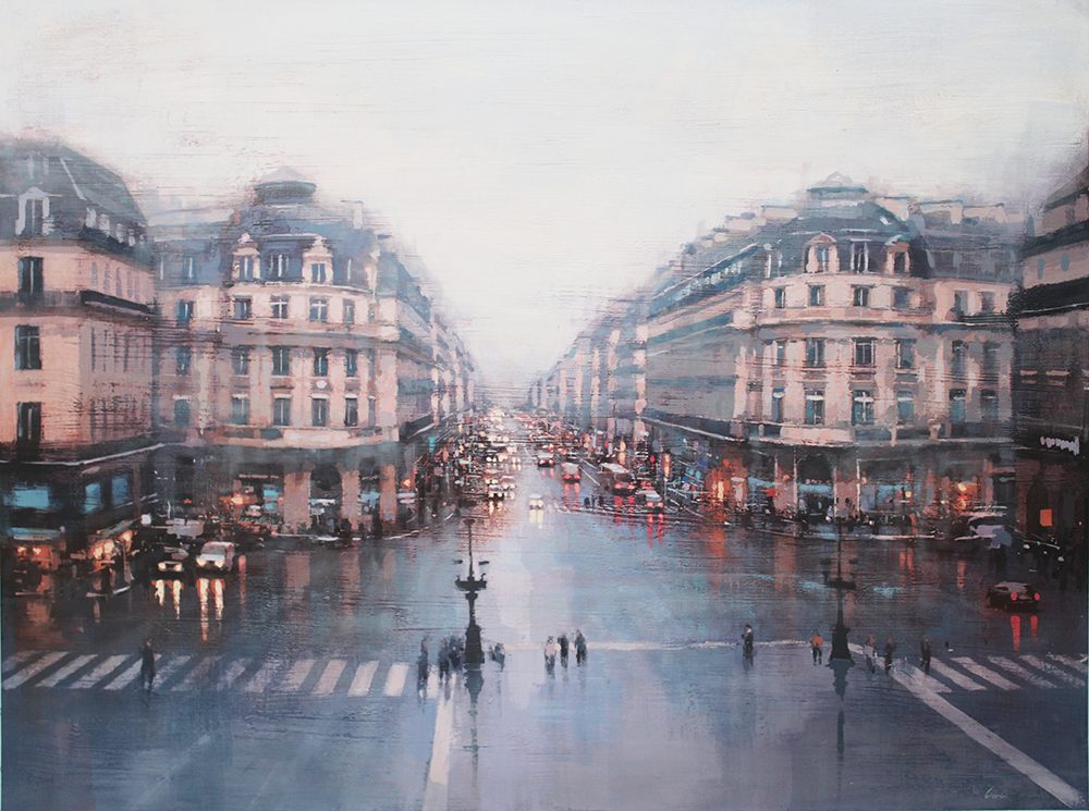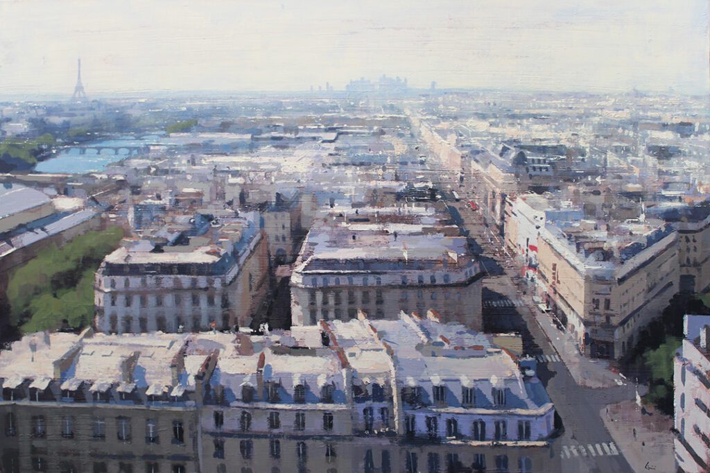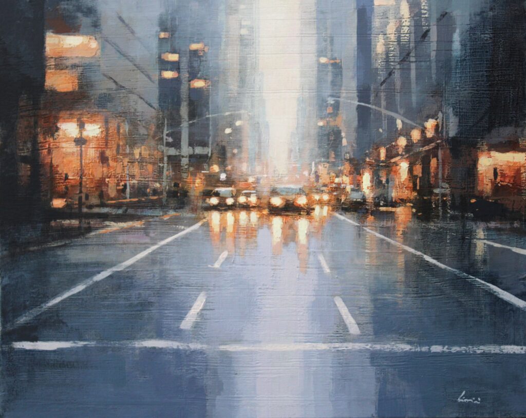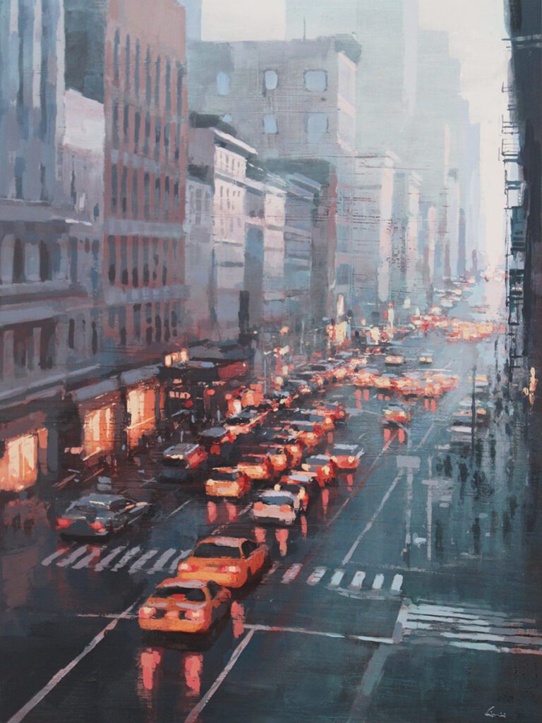Over years of painting, several fundamental hallmarks have come to the forefront in Cionini’s practice: space, perspective, vanishing point, and atmospheric perspective. These elements, combined with confident brushstrokes, contribute to his instantly recognizable cityscapes from around the world. New York, Los Angeles, Paris, Melbourne, and London are among his favored subjects.
