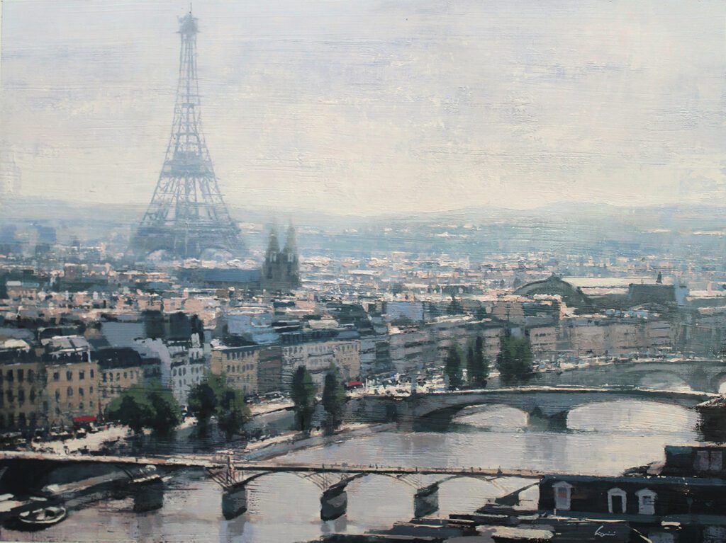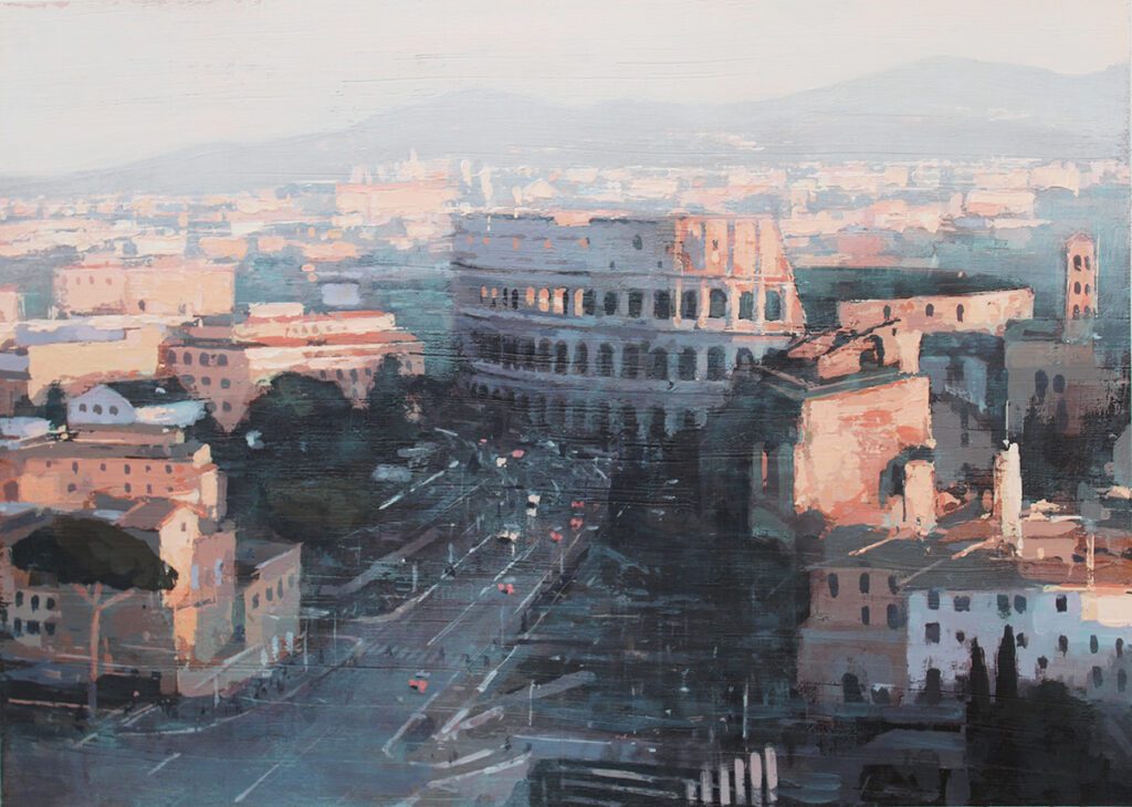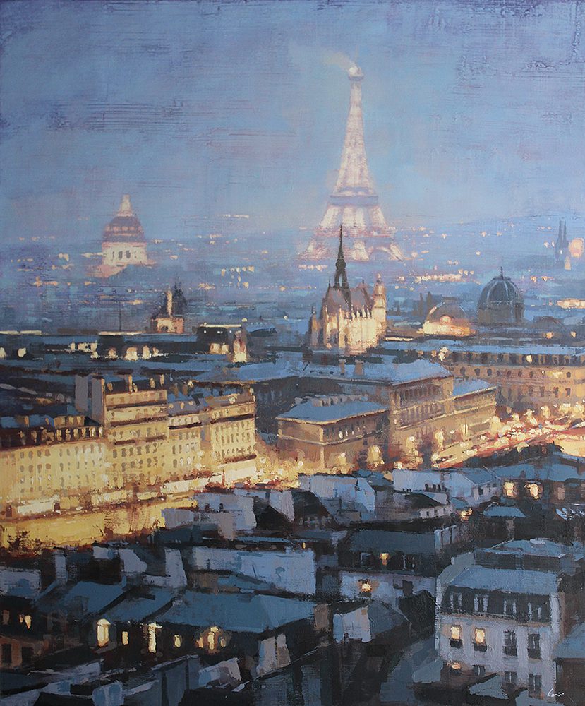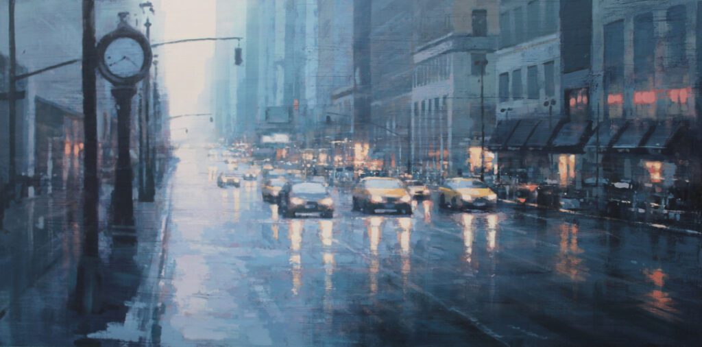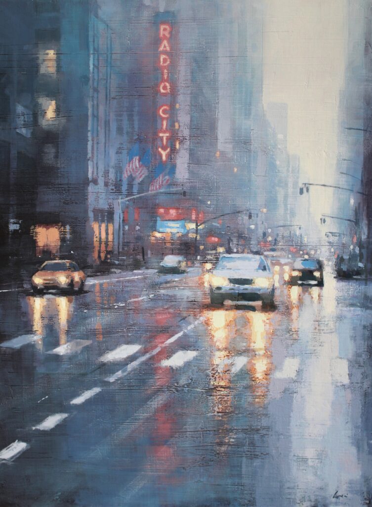 Over years of painting, several fundamental hallmarks have come to the forefront in Cionini’s practice: space, perspective, vanishing point, and atmospheric perspective. These elements, combined with confident brushstrokes, contribute to his instantly recognizable cityscapes from around the world. New York, Los Angeles, Paris, Melbourne, and London are among his favored subjects.