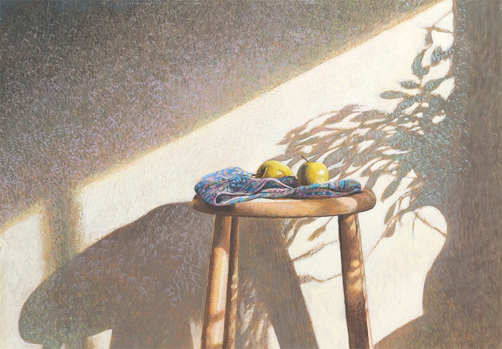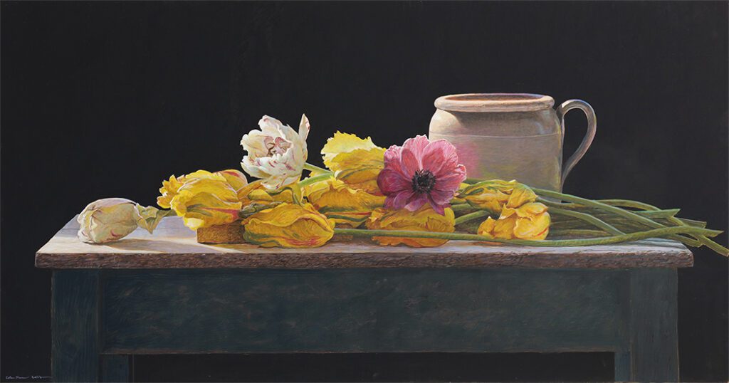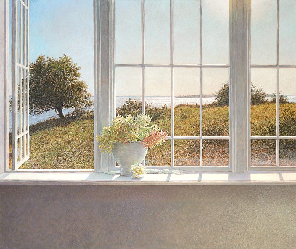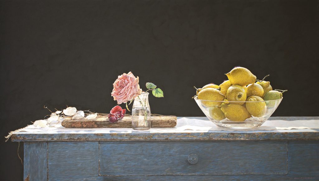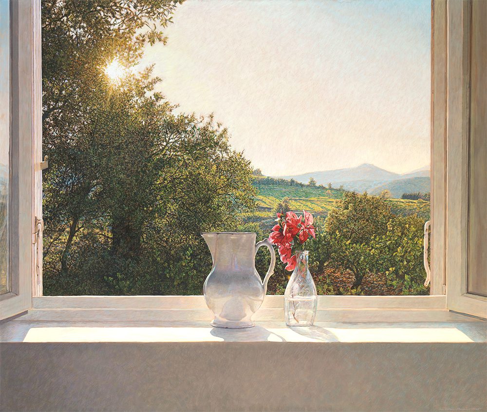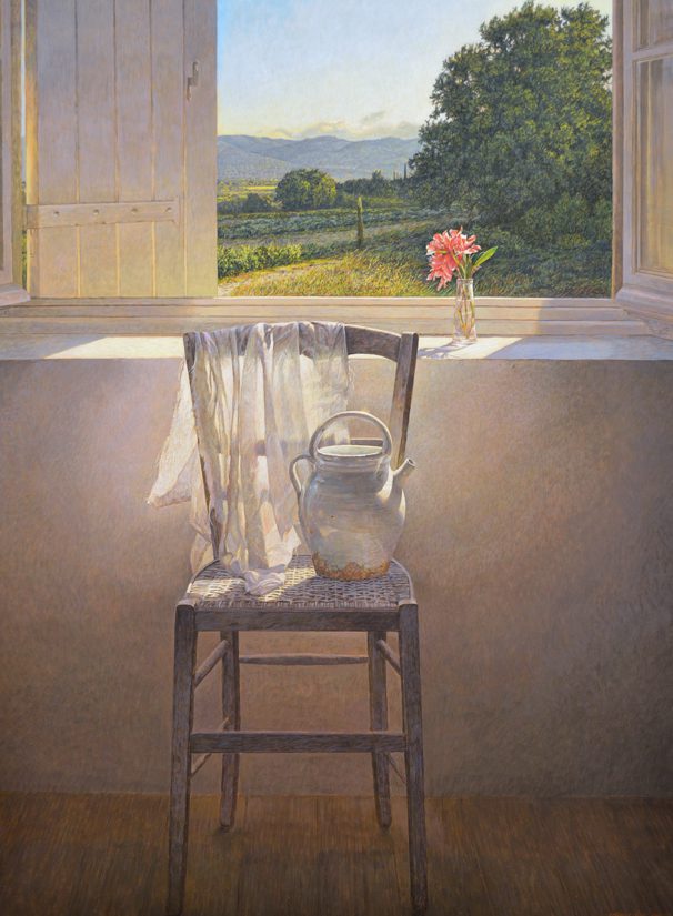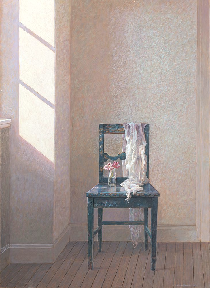 Colin Fraser is a contemporary Scottish painter, who is recognized for his intricate still lifes, interiors, and landscapes. He was born in Glasgow, Scotland in 1957 and received training to become a teacher at Brighton Polytechnic in England. Fraser taught courses in art for several years in the seaside town of Worthing, England. He moved to Sweden in 1981 to fulfill a teaching position, but left this role in 1983 to pursue painting and to exhibit his work full time. As an artist he has mastered watercolors, oils, and acrylics. However, he preferred a medium that was more convenient for traveling than oil and more durable than watercolor. Thus, he began reading books about the egg-tempera painting technique and taught himself. This painting technique was the primary technique used during the Byzantine Period and the Italian Renaissance. The egg yolks are mixed with pigment, it’s a permanent, quick drying mixture, and creates stunning effects within works of art. Egg-tempera technique gives Fraser’s work a translucent, bright quality, which makes his compositions feel extremely open and freeing. The artist says; “It’s a medium fraught with technical difficulties, but therein lies its charm. Brushstrokes dry instantly and are never fully opaque, so just about every mark the painter makes shows.” Colin Fraser and his wife currently live in Sweden with their two children.