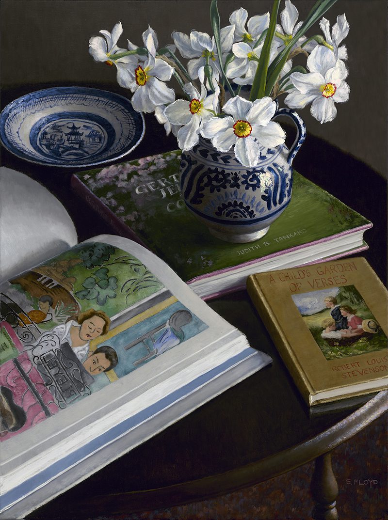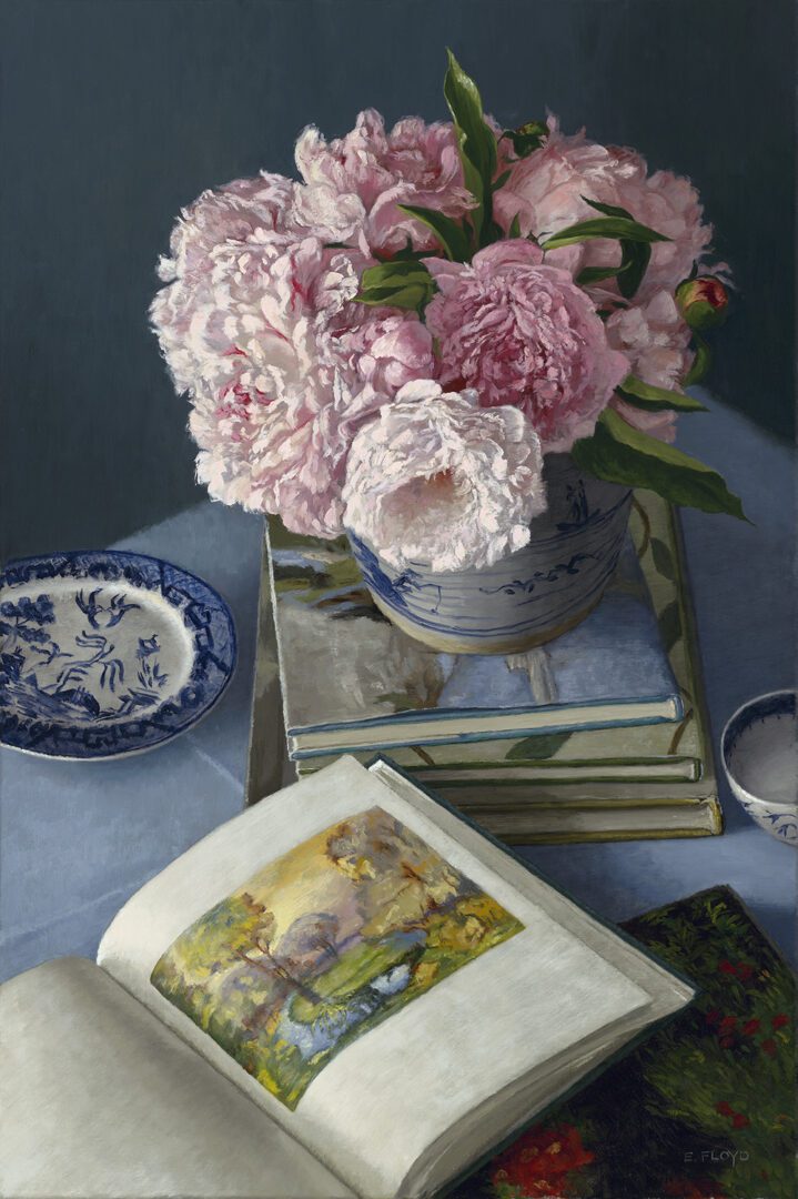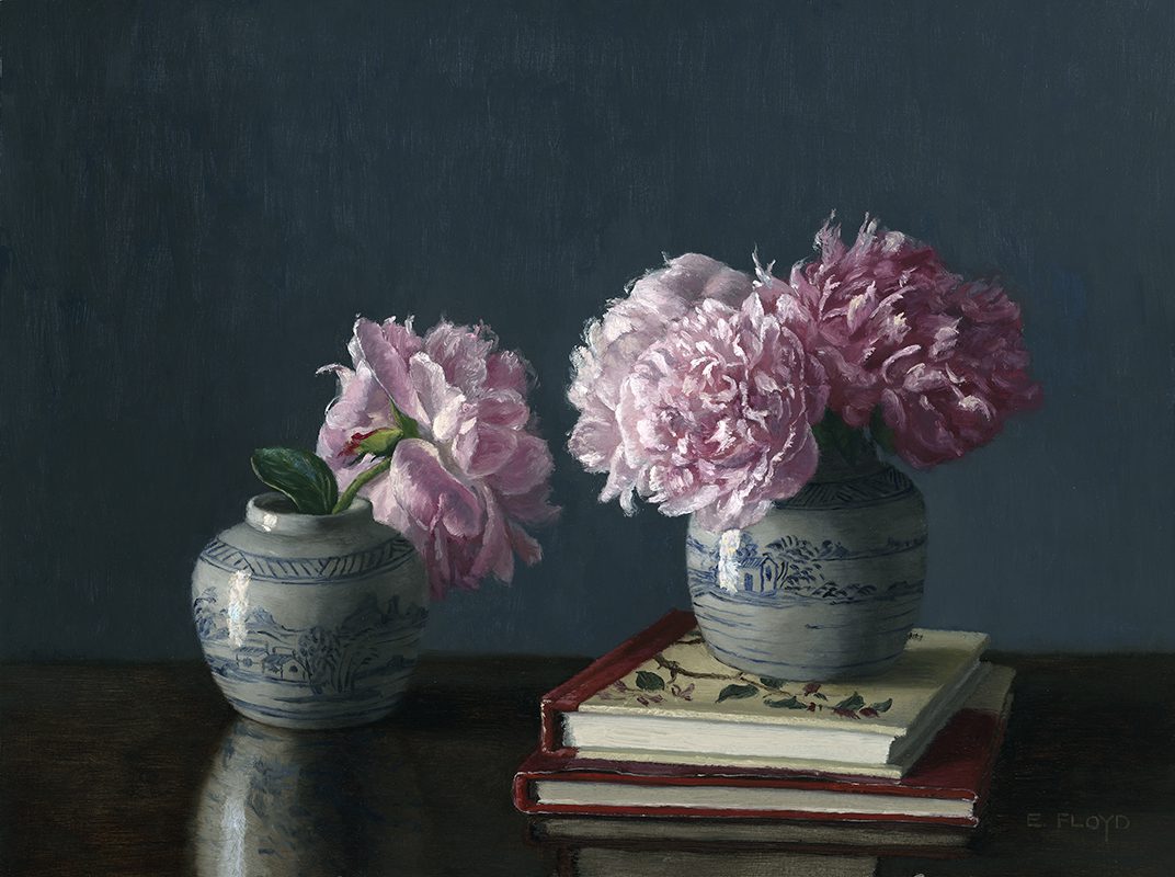 Elizabeth loves painting the flowers she grows in her own garden. She works with oils in a colorist manner utilizing a full-color palette. She applies layers of color tints wet-in-wet in order to build up form, value, and color. Her work is highly rendered, but she allows brushwork to exhibit the textural effects that paint application can achieve. When focusing on still life, her studio practice is to work from life in only natural light.
