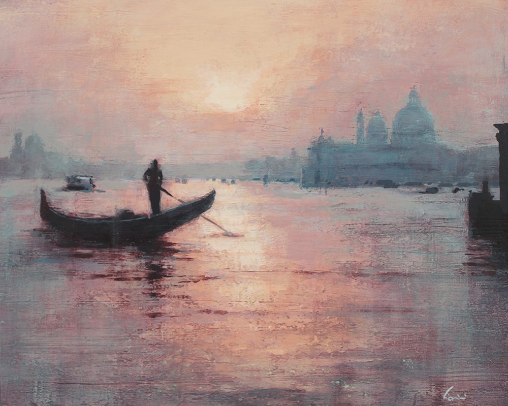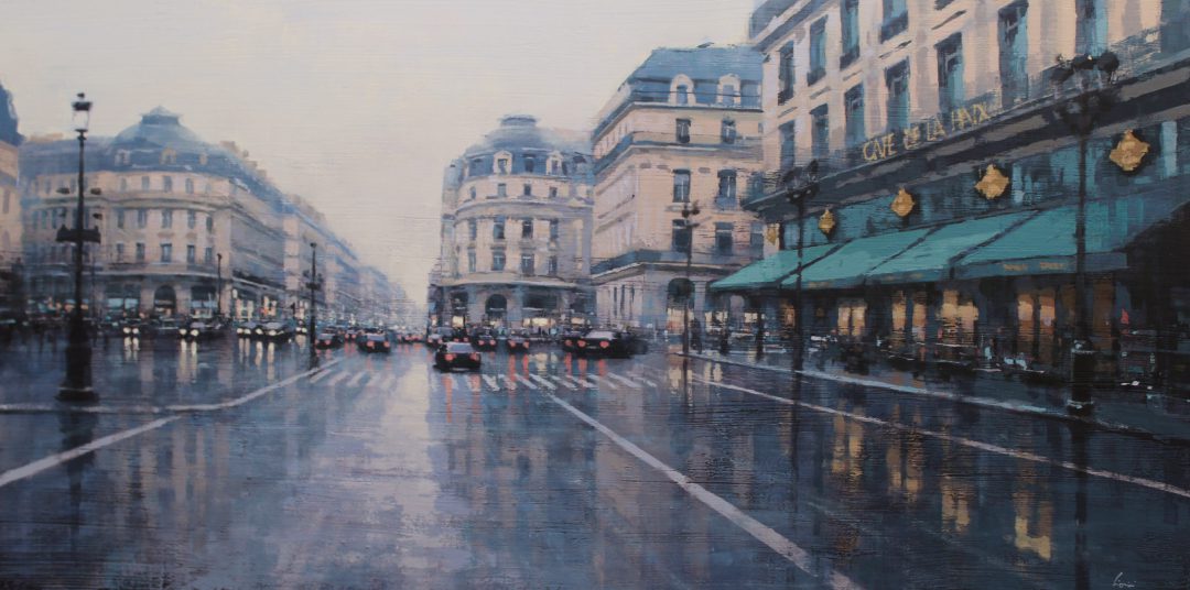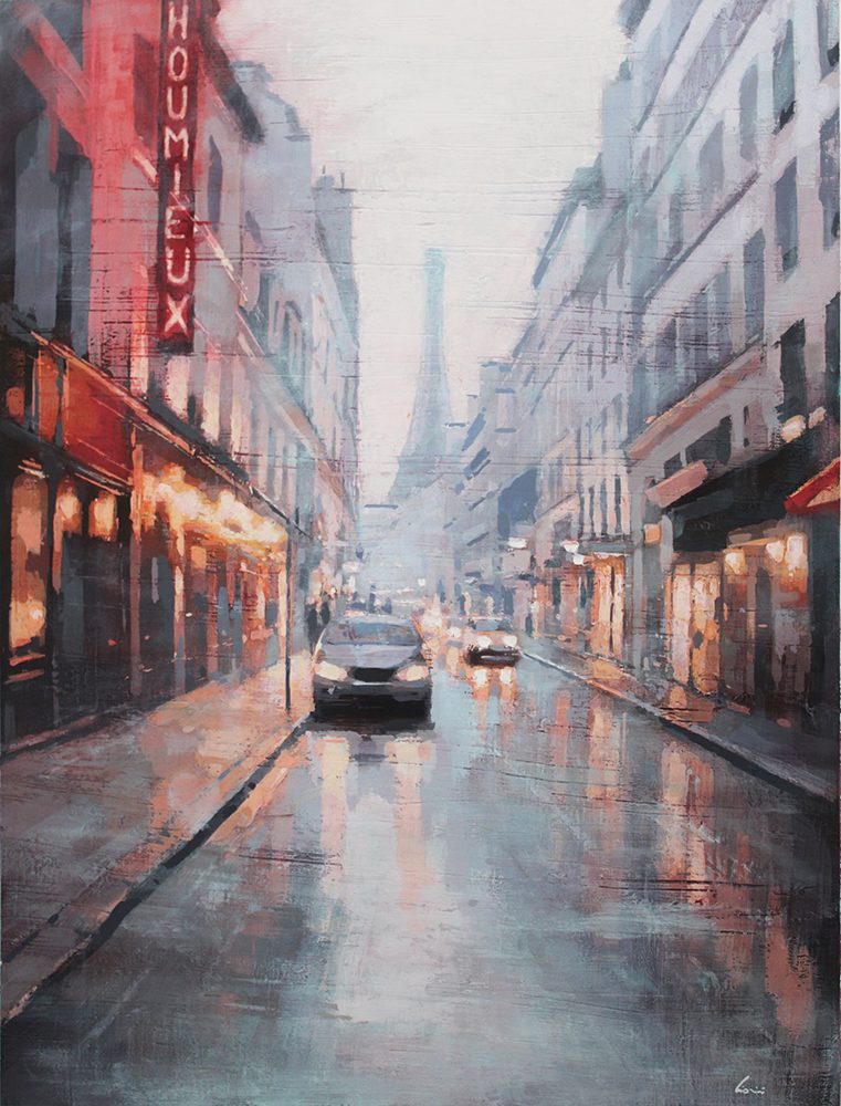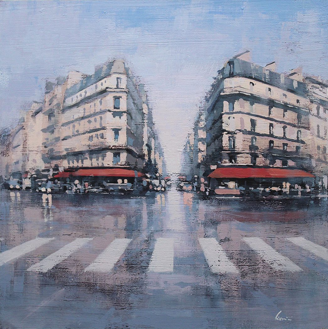 Cionini and Laguë each capture the pulse of modern life in distinct, compelling styles. Cionini’s romantic cityscapes are washed in soft light and atmosphere, offering quiet, rain-slicked views of Paris and beyond. His paintings evoke memory and motion, as if the viewer is walking those same streets, surrounded by the glow of evening.