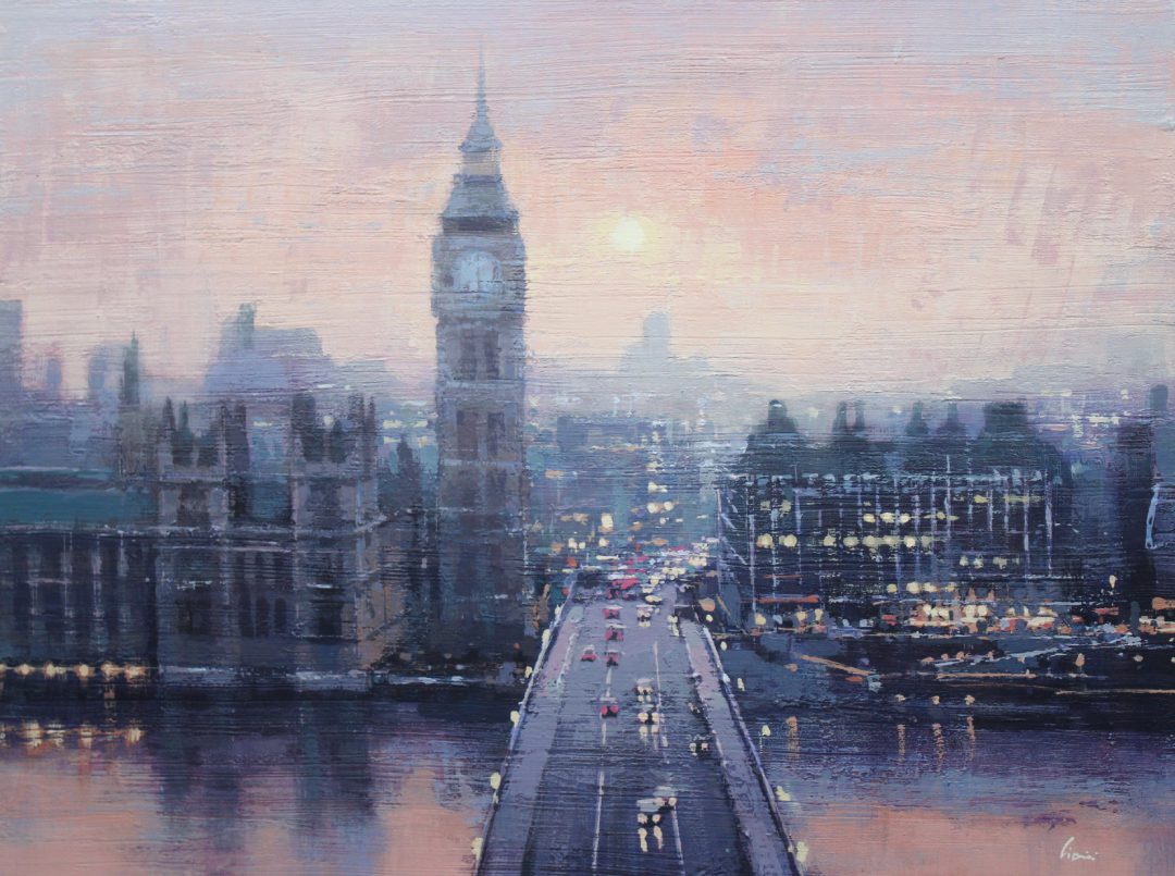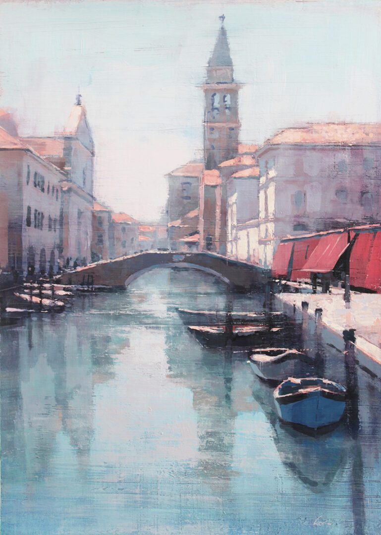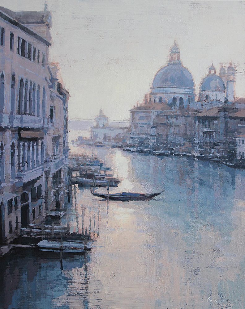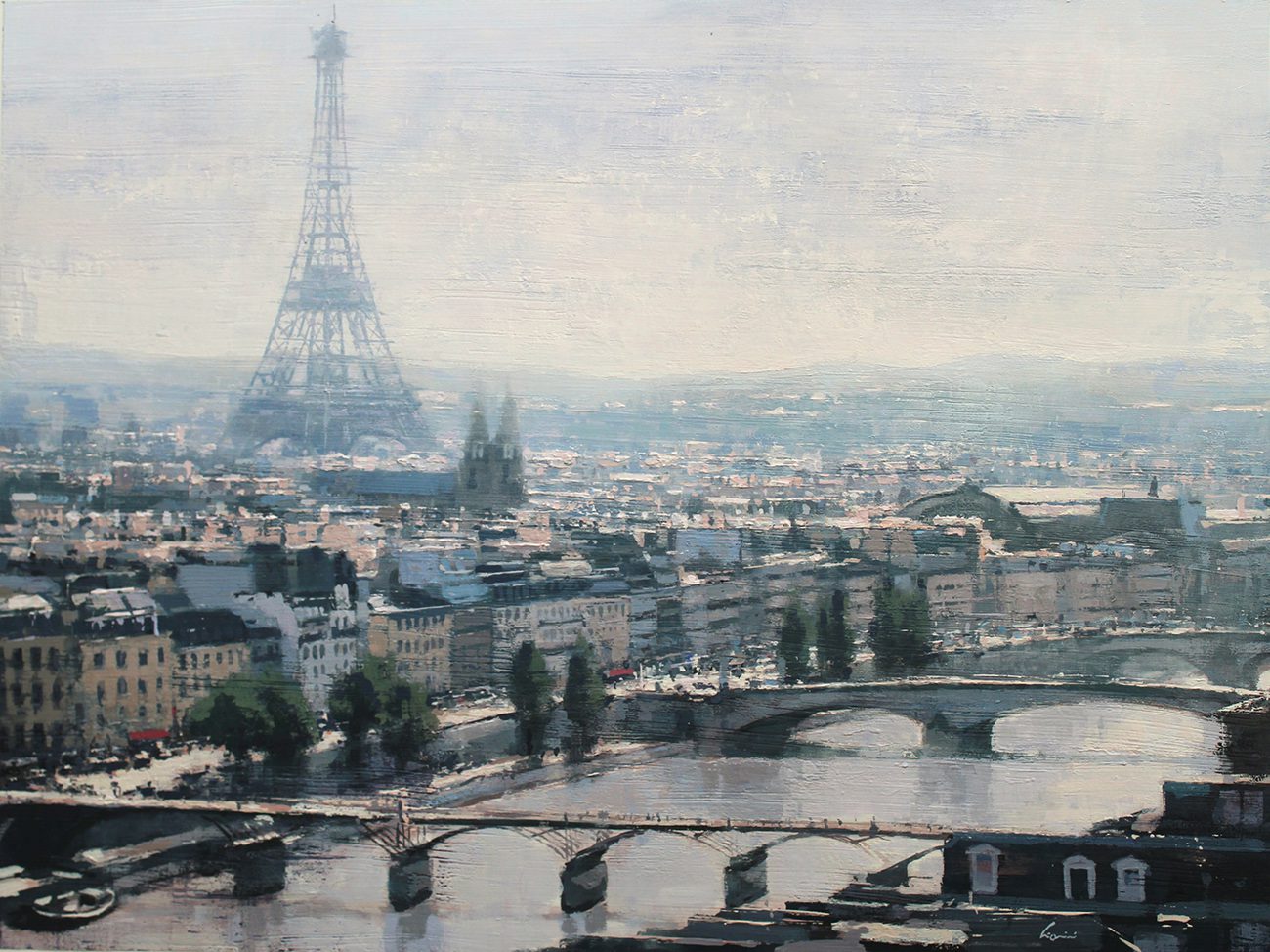 Cionini and Laguë each capture the pulse of modern life in distinct, compelling styles. Cionini’s romantic cityscapes are washed in soft light and atmosphere, offering quiet, rain-slicked views of Paris and beyond. His paintings evoke memory and motion, as if the viewer is walking those same streets, surrounded by the glow of evening.