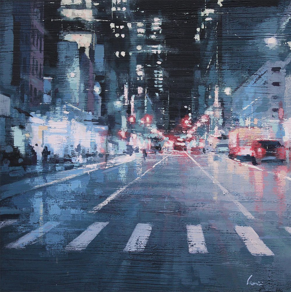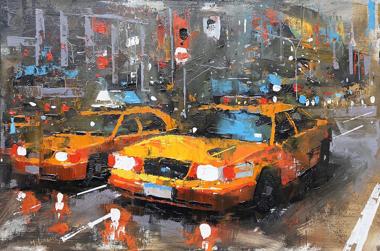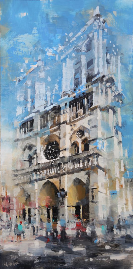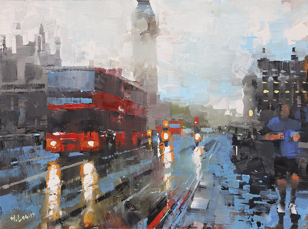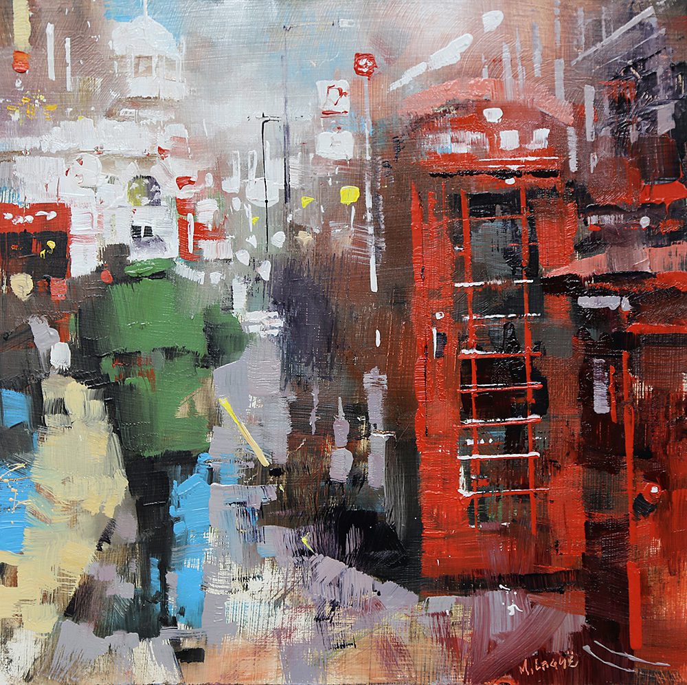 By contrast, Laguë’s canvases hum with energy. Through confident brushwork and bold color, he distills the architecture and intensity into striking compositions that balance chaos and control. His perspectives are fresh, dynamic, and thoroughly contemporary.