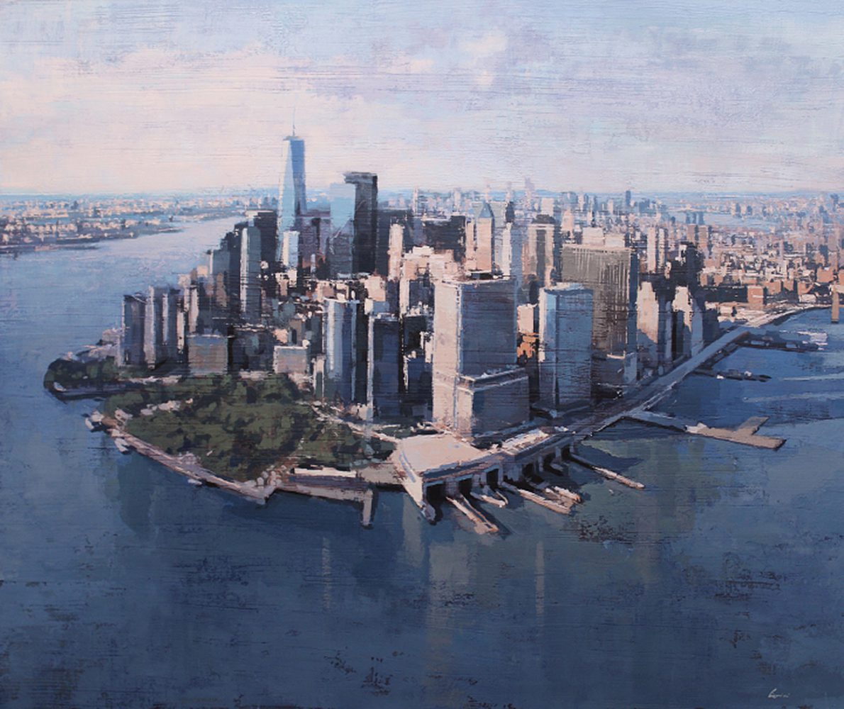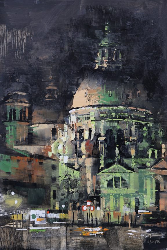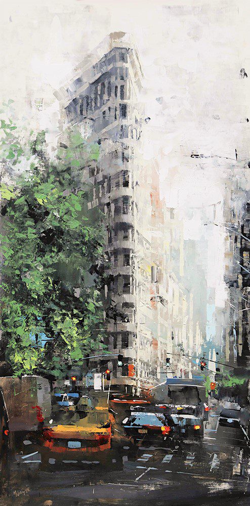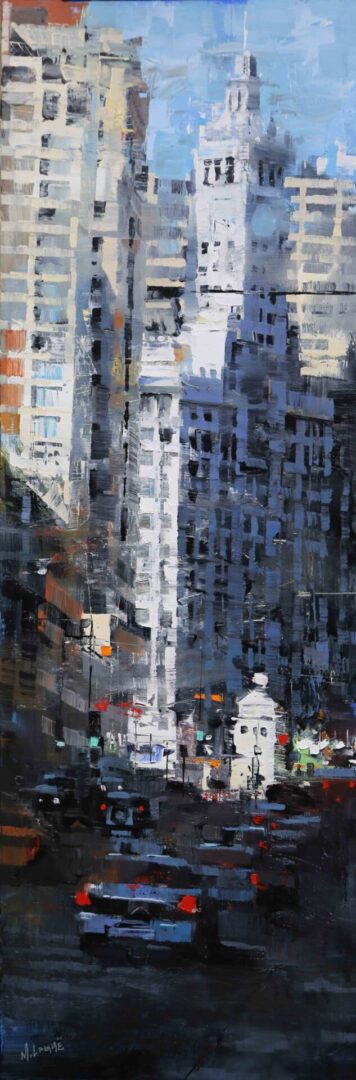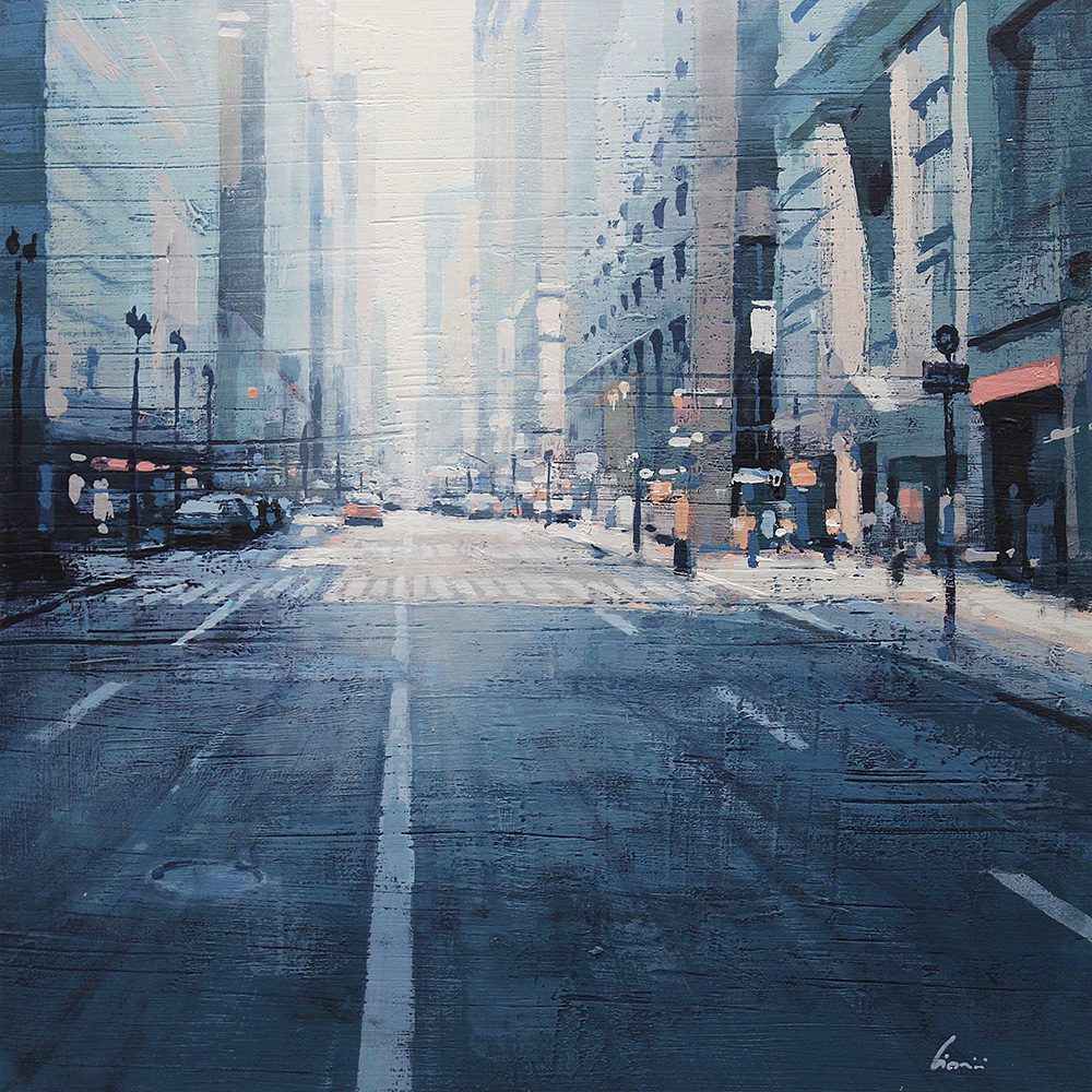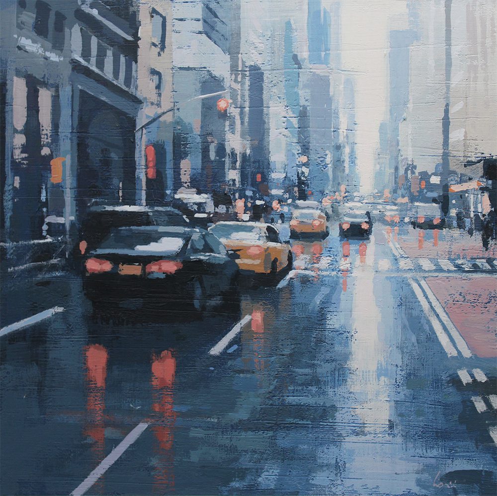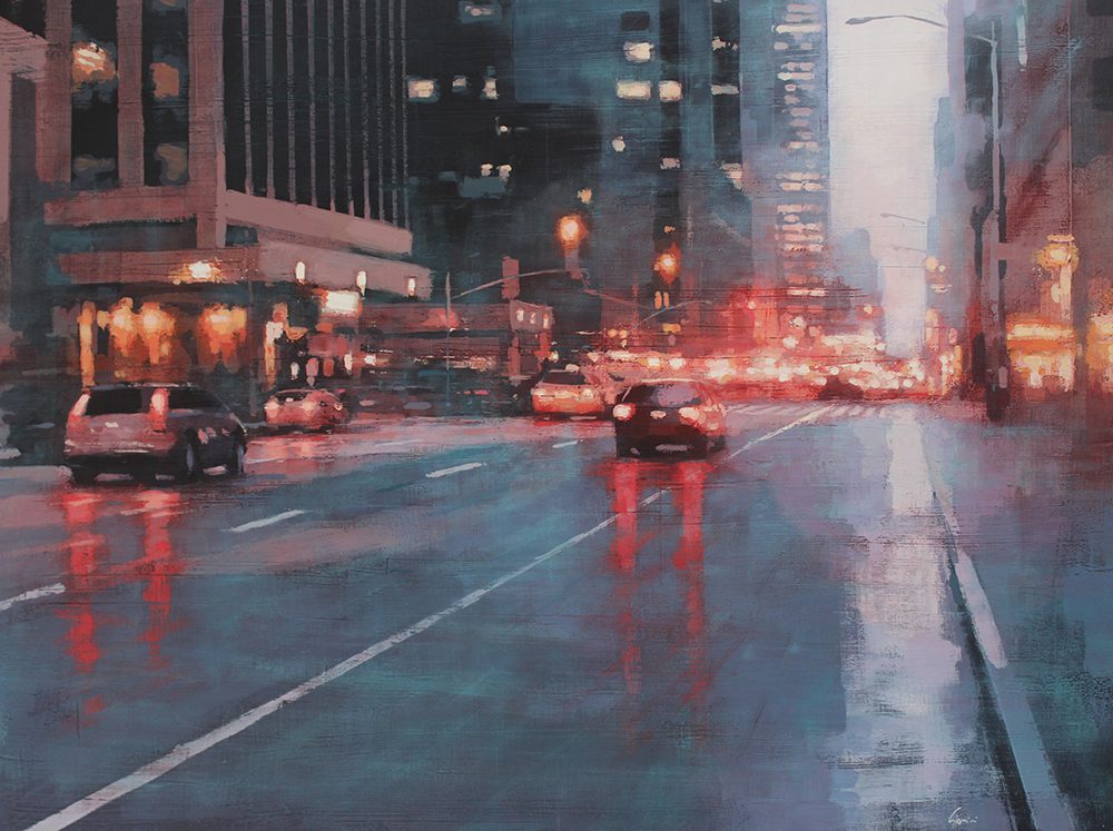 By contrast, Laguë’s canvases hum with energy. Through confident brushwork and bold color, he distills the architecture and intensity into striking compositions that balance chaos and control. His perspectives are fresh, dynamic, and thoroughly contemporary.
