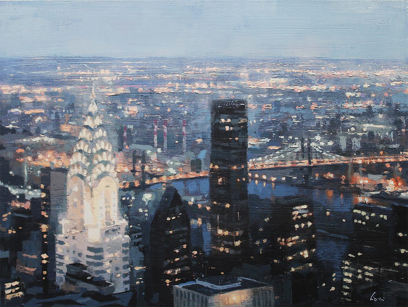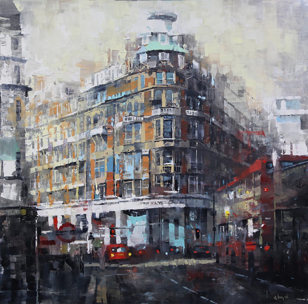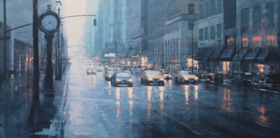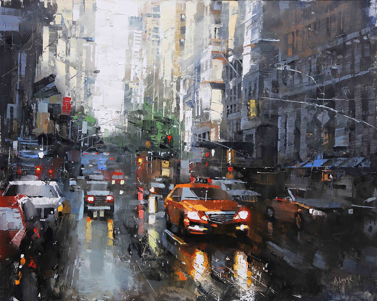 By contrast, Laguë’s canvases hum with energy. Through confident brushwork and bold color, he distills the architecture and intensity into striking compositions that balance chaos and control. His perspectives are fresh, dynamic, and thoroughly contemporary.