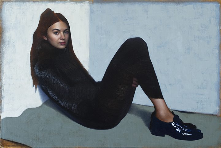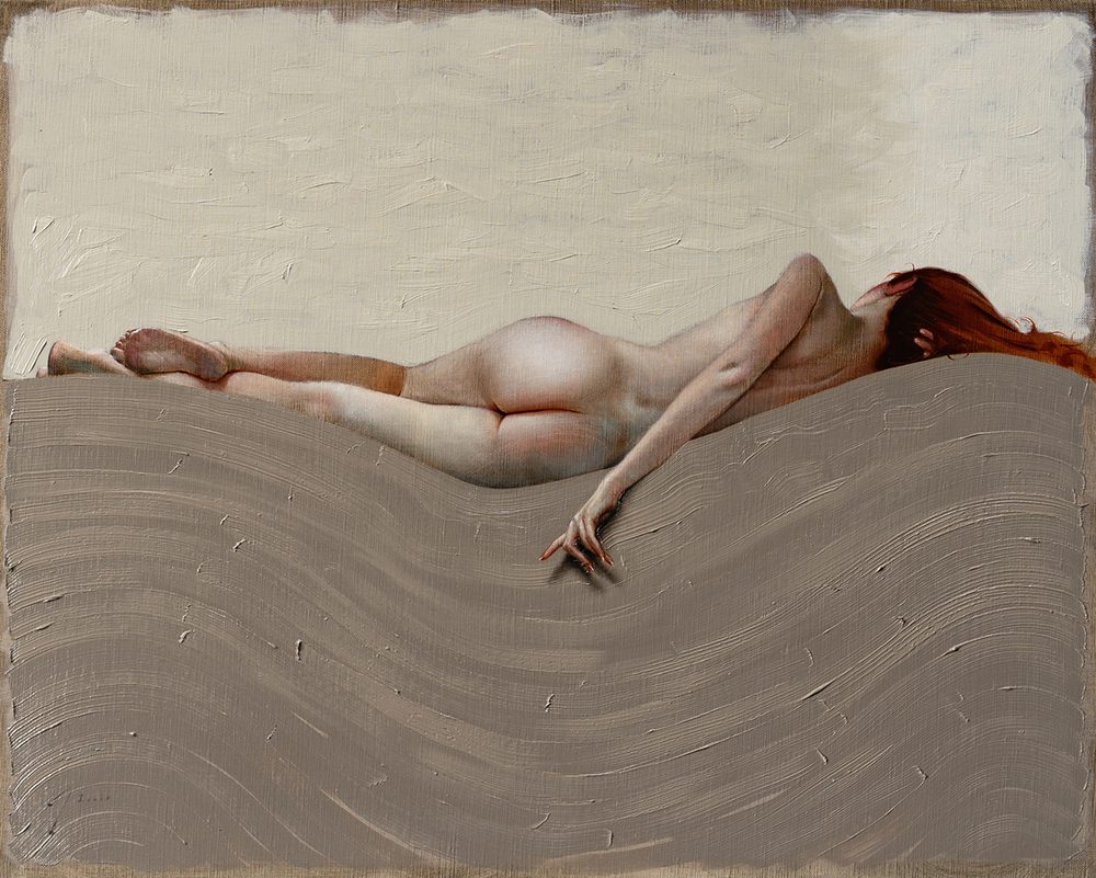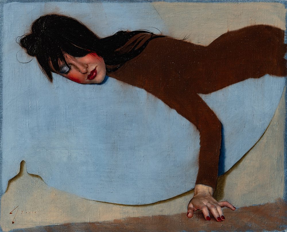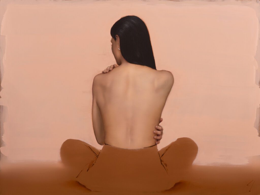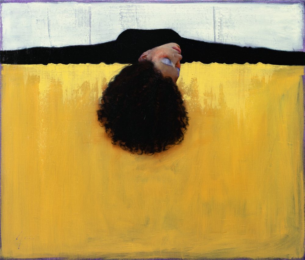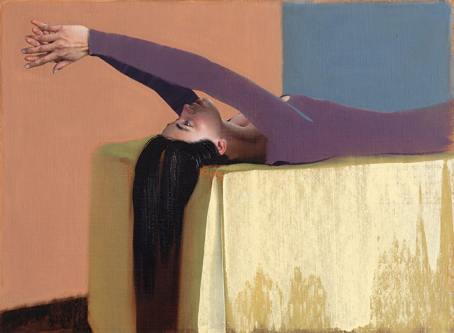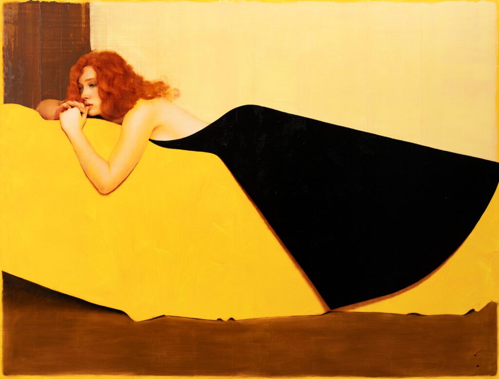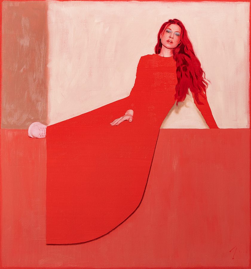 The figures in his paintings are always in contemplative and often curiously surreal poses. They conceal and reveal the environment, dissecting it through perspective, gesture, and form. They act as guides through the painted space; their elongated anatomy highlights divides or unites the composition.