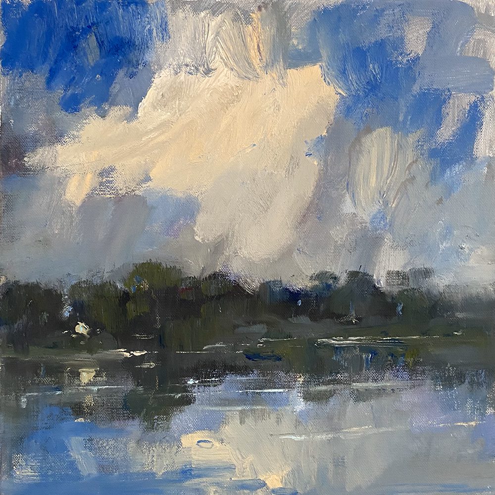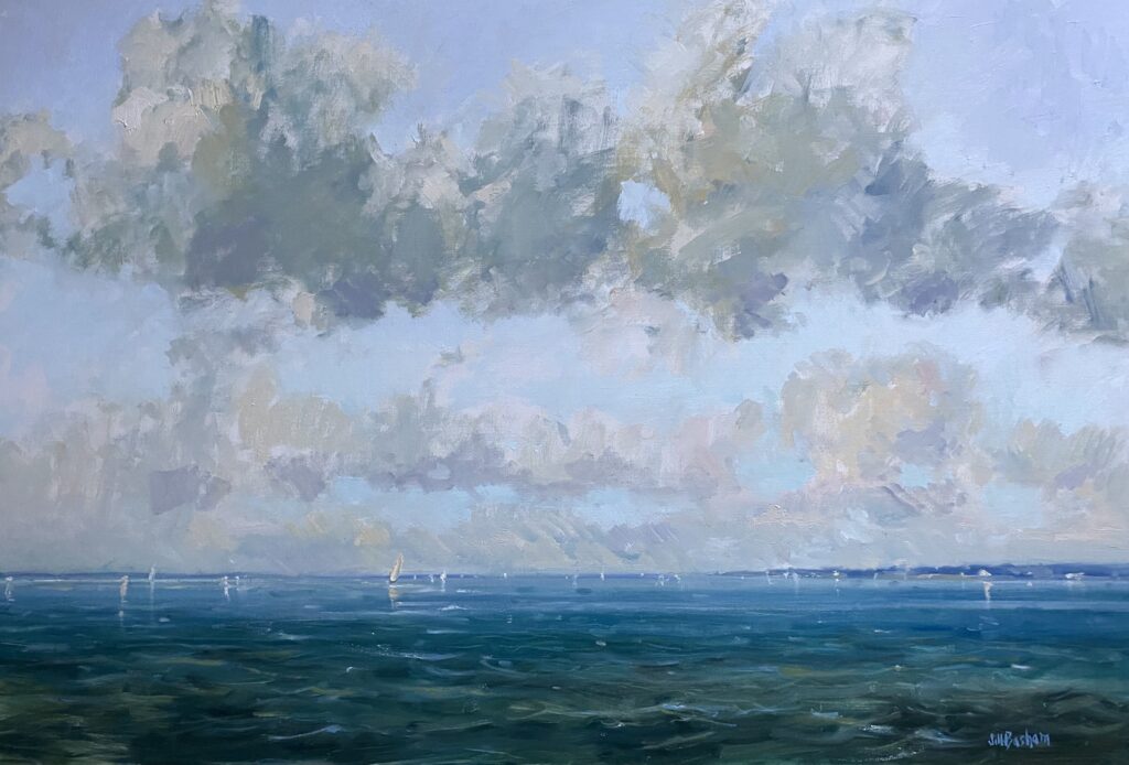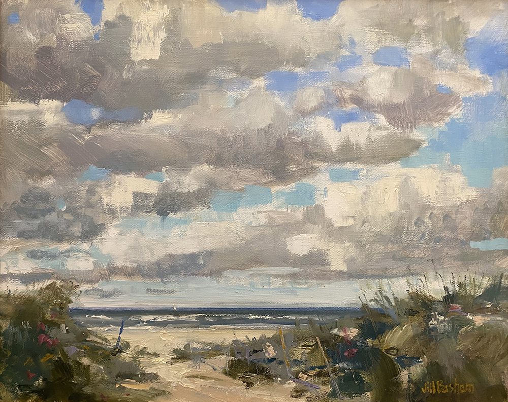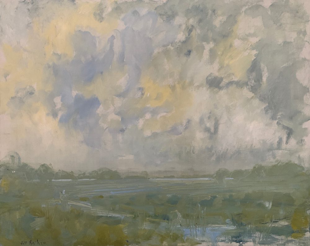 Jill’s work is typically quiet, often with muted colors and purposefully simple design. She is dedicated to conveying the light, atmosphere, and “feeling” of the landscapes she paints, whether natural or manmade, and wants to evoke an emotional reaction. Basham paints in her Maryland studio near the Chesapeake Bay, as well as outdoors, in locations both far and near. She is comfortable allowing each painting and its subject to lead her on an exploratory, experimental journey, as this approach often yields the most unexpected and visually exciting results.