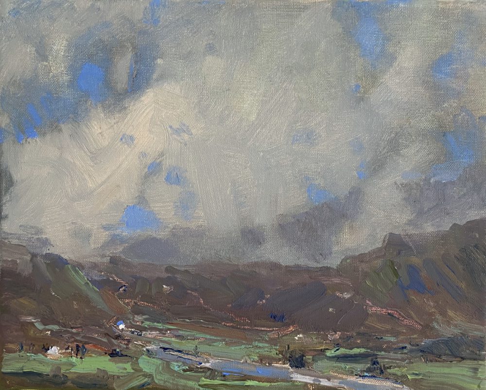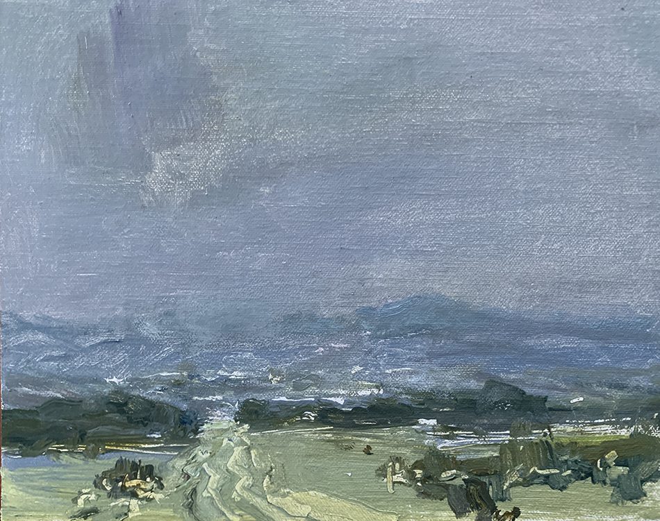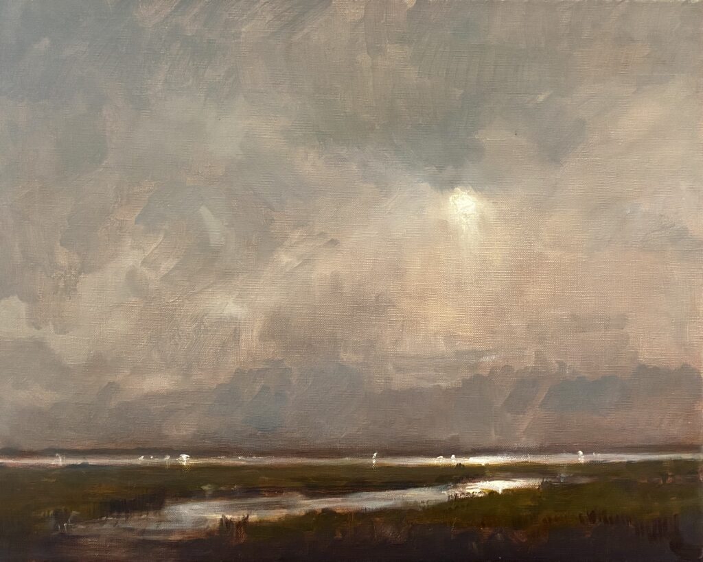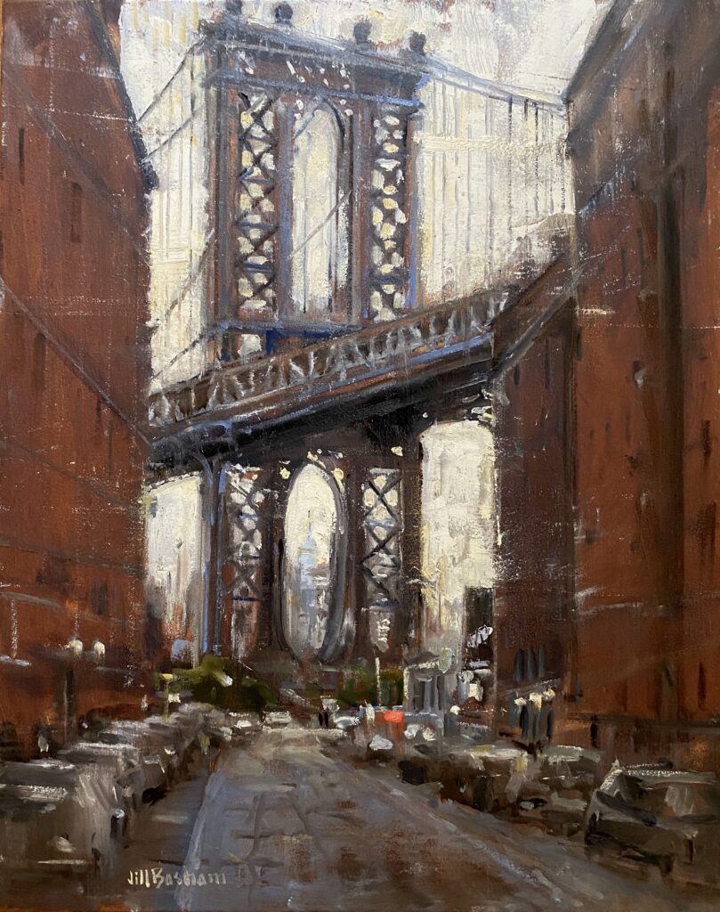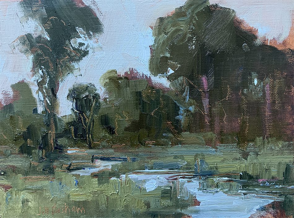 Jill’s work is typically quiet, often with muted colors and purposefully simple design. She is dedicated to conveying the light, atmosphere, and “feeling” of the landscapes she paints, whether natural or manmade, and wants to evoke an emotional reaction. Basham paints in her Maryland studio near the Chesapeake Bay, as well as outdoors, in locations both far and near. She is comfortable allowing each painting and its subject to lead her on an exploratory, experimental journey, as this approach often yields the most unexpected and visually exciting results.