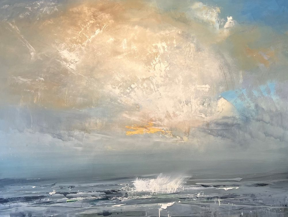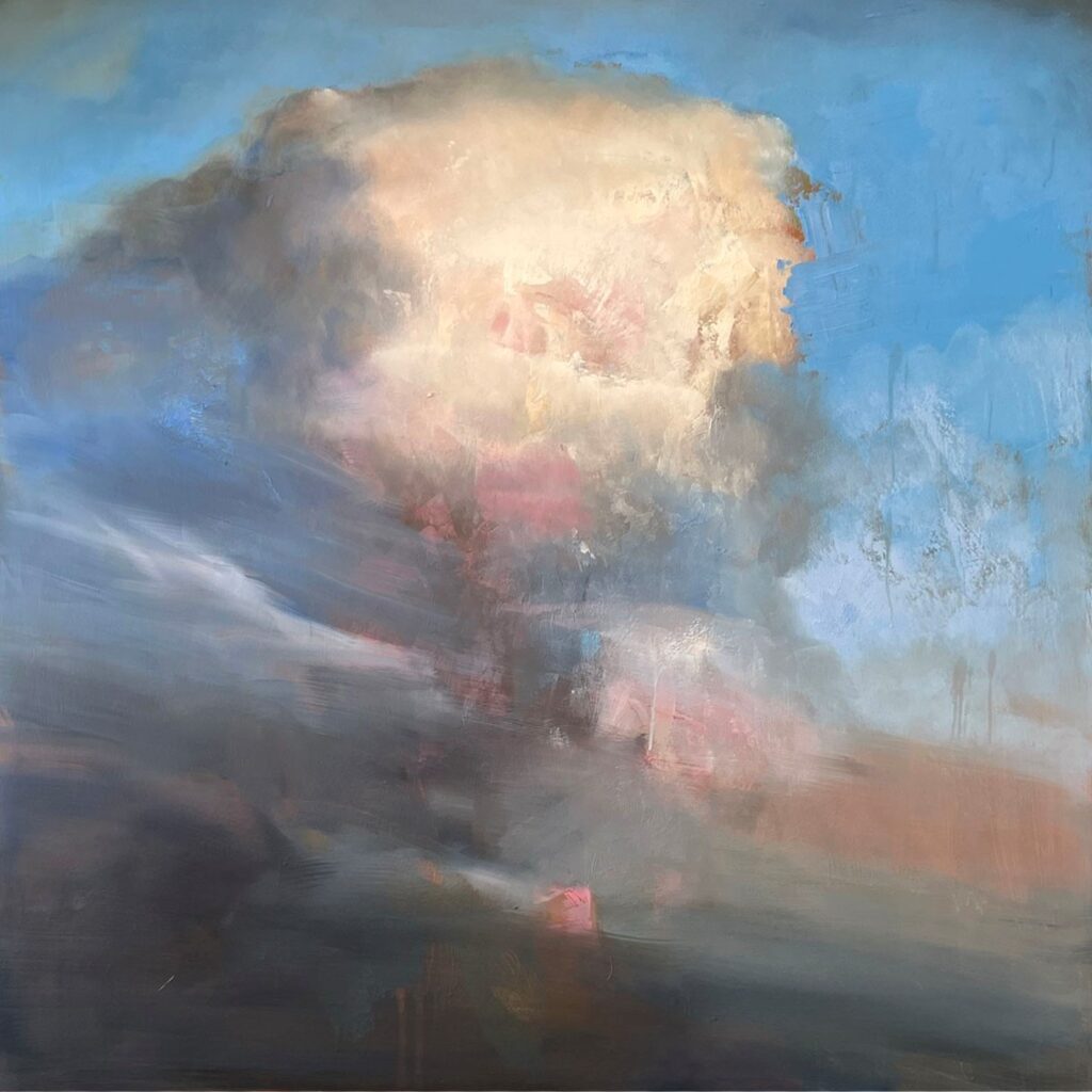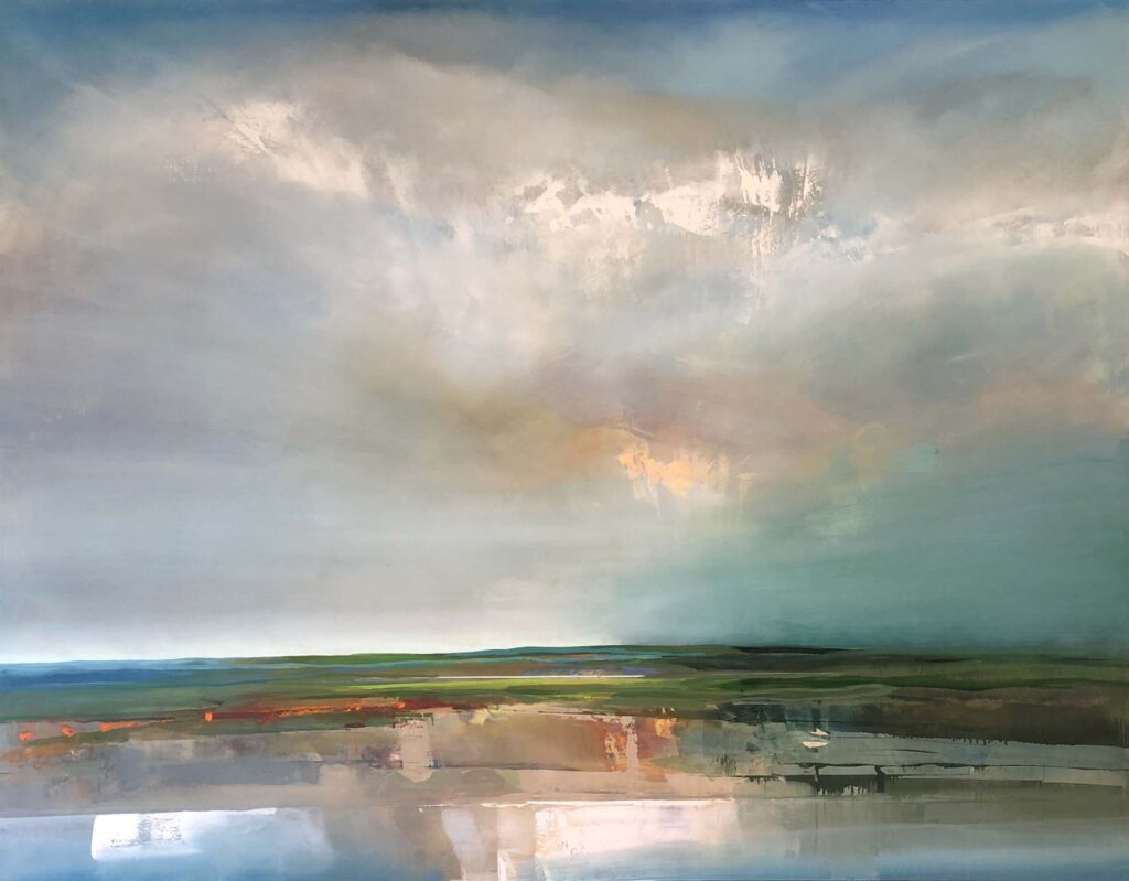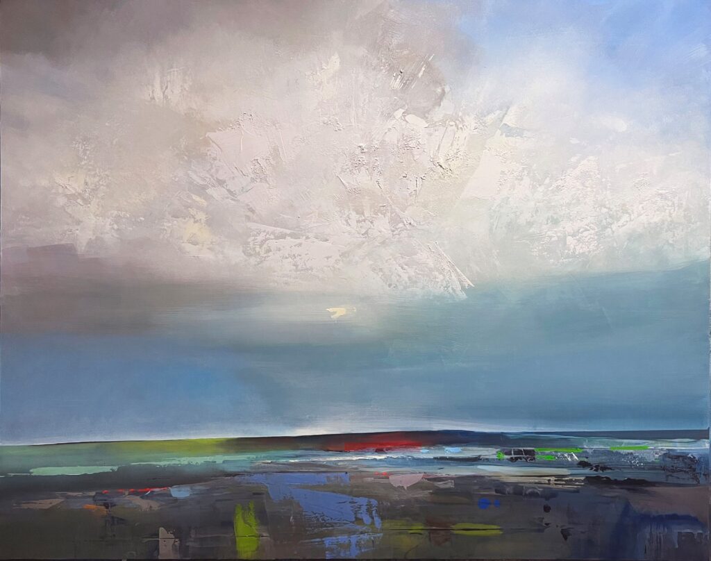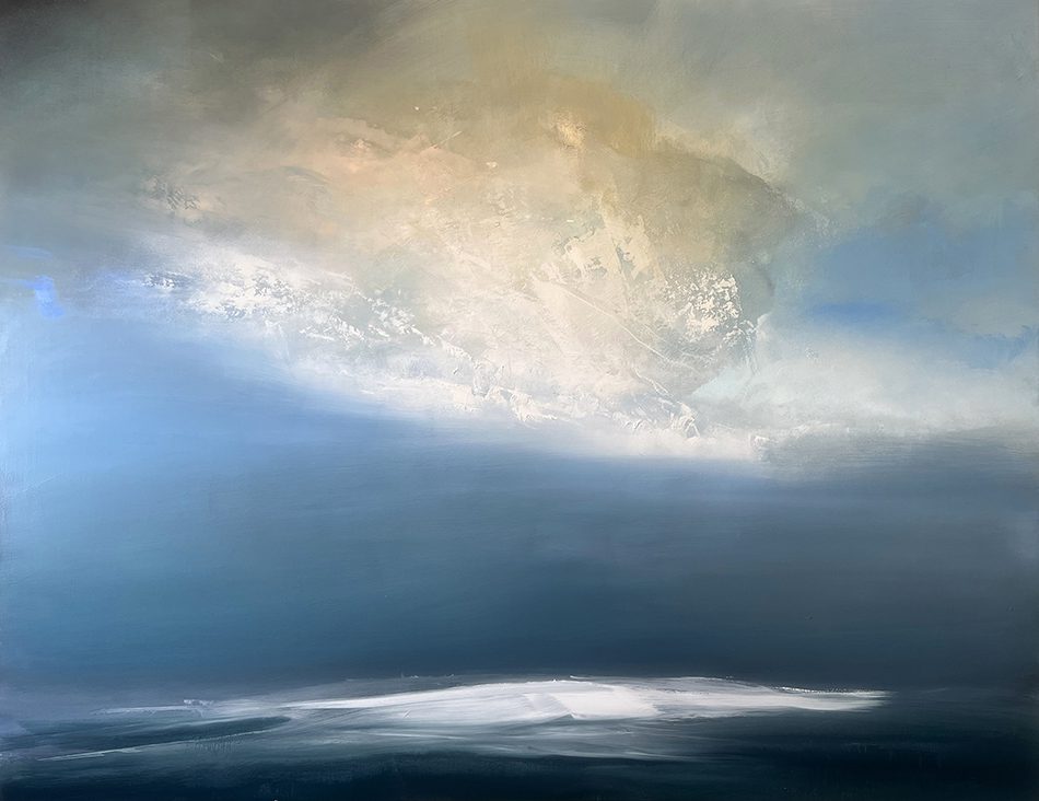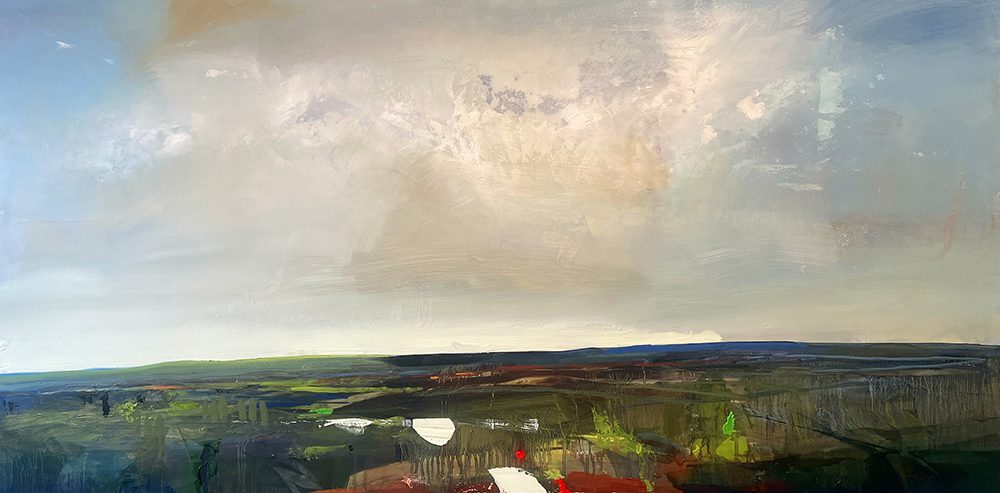 The resulting landscape images are full of light, space, color, softly undulating hills that disappear and reappear and broad expansive skies, and yet little sense of human presence or architecture. They combine a strong sense of the abstract with the organic, essentially allowing nature to be nature. The oil paint is allowed to drip, build up, or be scraped back, resulting in the totality of the final image to evoke a variety of qualities that tap into Kearns’ very personal responses to the subject matter.